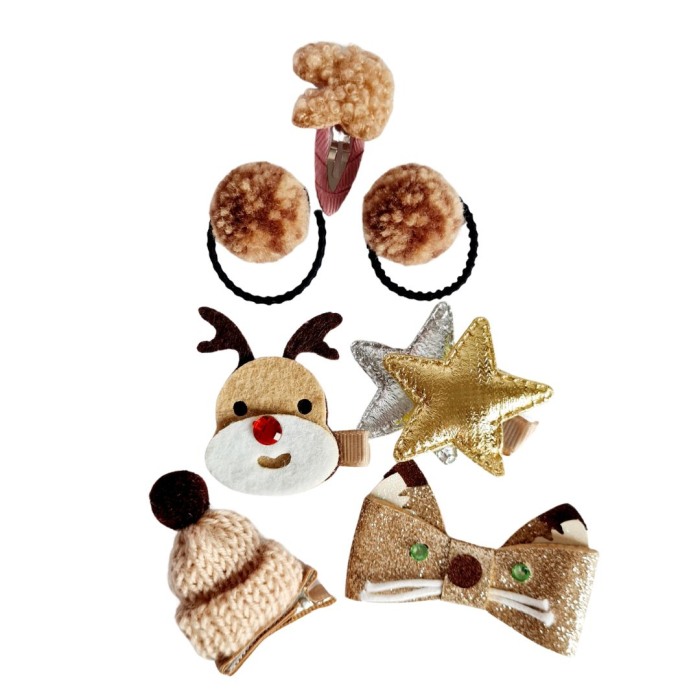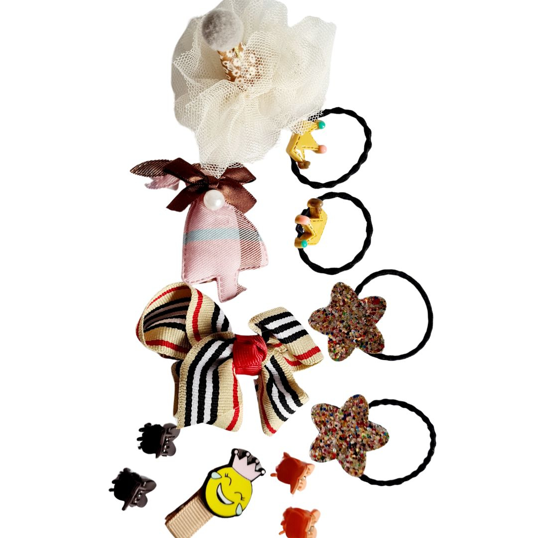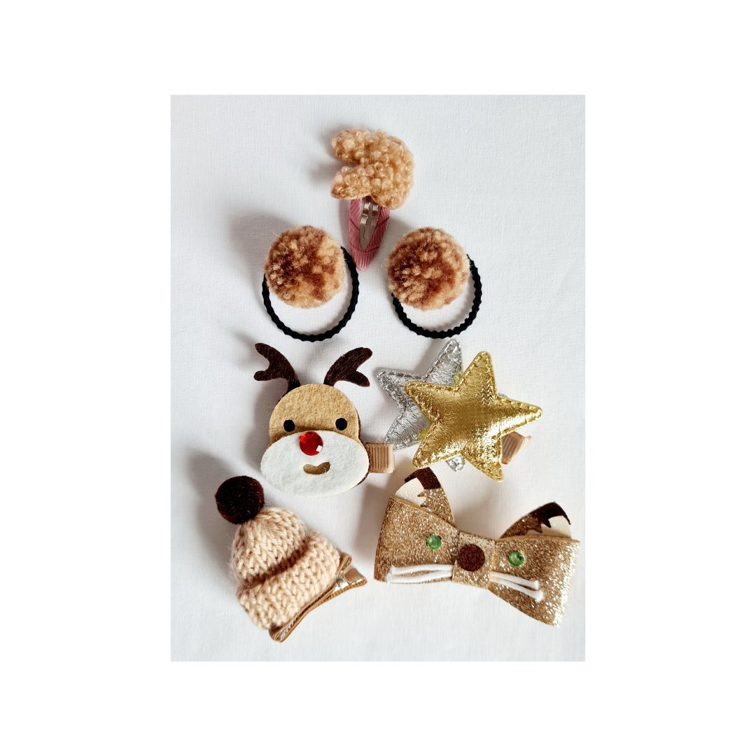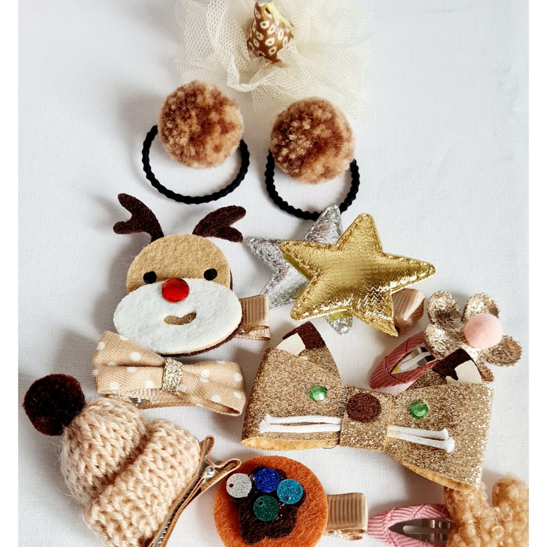 Set Auriu 24 de accesorii pentru par - DroolVin ambalate intr-o cutiuta tip gentuta de culoare roz. Cauti un cadou pentru o fetita? Ai gasit fdeja unul!Setul cuprinde 6 elasice de par, 4 agrafe de par micute si 14 clame in nuante de rosu cu forme si materiale diferite: ren, stele, caiulita, fundita, ciucuri, etc.Culoare: predominant bejMaterial: Poliester, PVC. metalVarsta: 3-6 ani