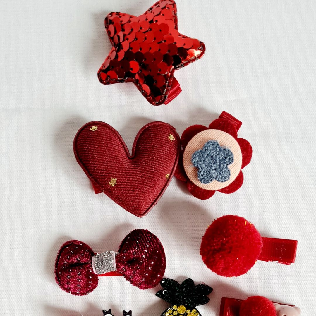 Set Rosu 24 de accesorii pentru par - DroolProdusele vin ambalate intr-o cutiuta tip gentuta de culoare roz.Setul cuprinde 6 elasice de par, 4 agrafe de par micute si 14 clame in nuante de rosu cu forme si materiale diferite: stea pui, glostr, utulrt, inimioara, gitafa, ananas, ciucure etcCuloare: predominant rosuMaterial: Poliester, PVC. metalVarsta: 3-6 ani