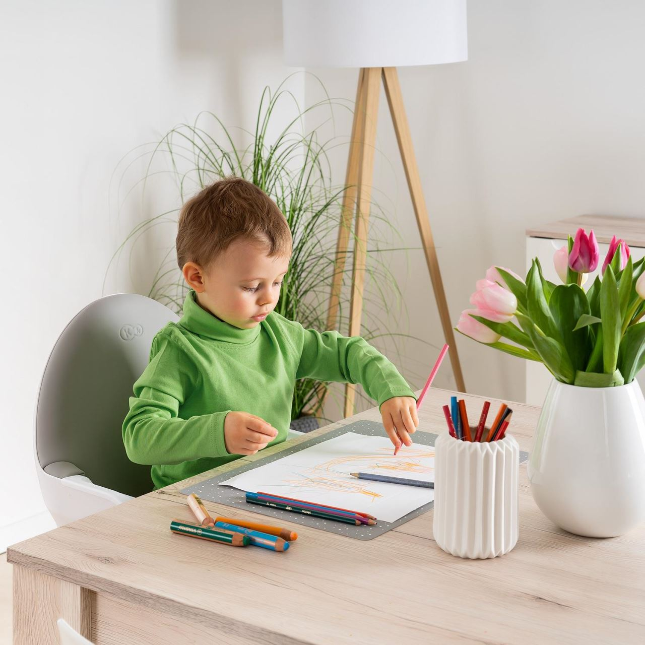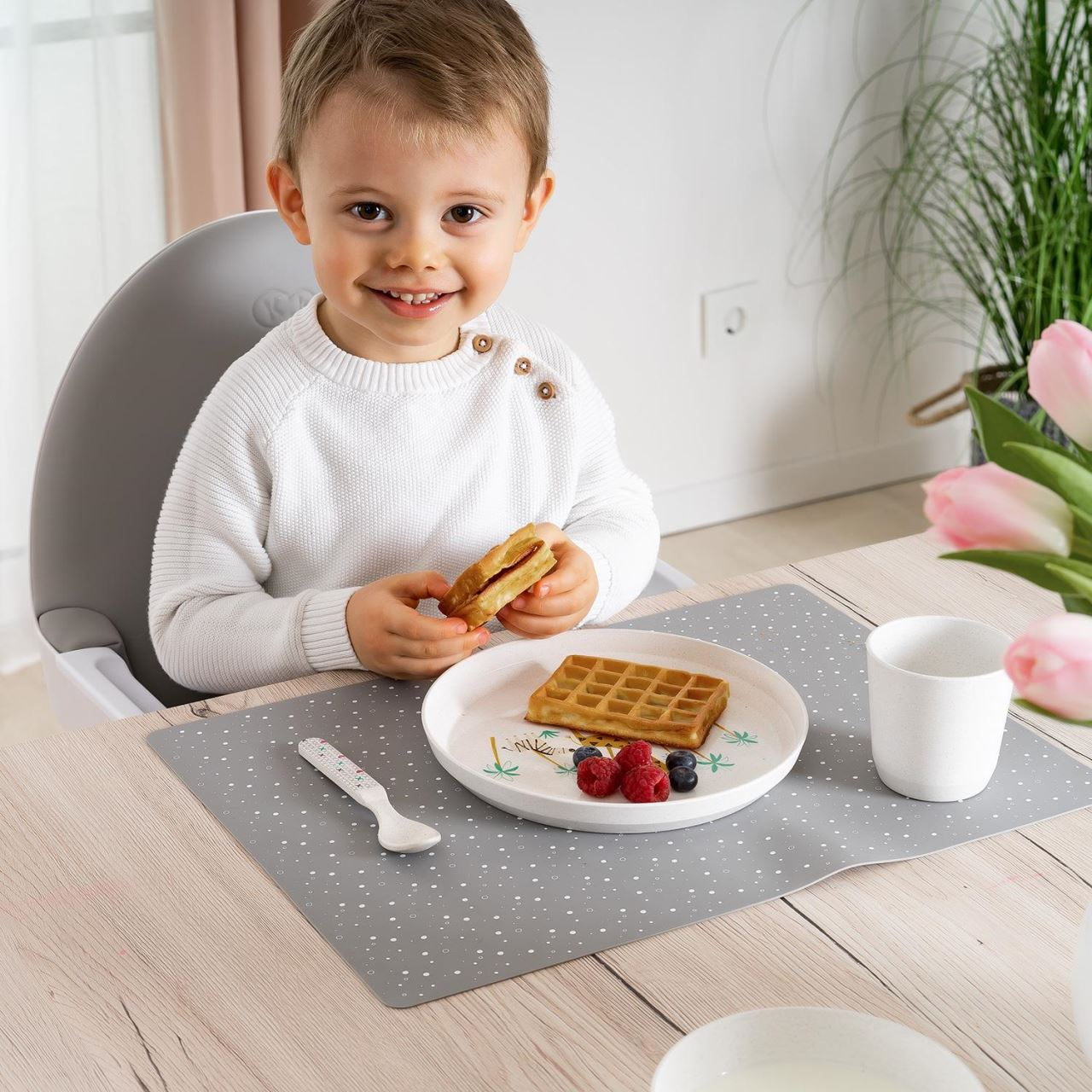 Mai multa relaxare in timpul mesei! Copiii sunt energici si pusi pe distractie si in timpul mesei, iar micile incidente, desi sunt amuzante, necesita curatare imediata sau lasa in urma lor pete inestetice. Suportul de farfurii Eat'n Tidy este ajutorul tau de incredere atunci cand vine vorba de a proteja masa de murdarie si deteriorari. Previne ca alimentele, sucurile sau bauturile calde care s-au varsat sa lase pete permanente pe masa. Suportul este foarte durabil datorita materialului rezistent la caldura si hidrofug. In plus, previne deteriorarea de la zgarieturile cu tacamurile. Cu dimensiunile sale generoase de 41,5 x 30 cm, acest napron pentru copii ofera protectie pe o suprafata foarte mare a mesei de sufragerie. Mancarea cade pe suport si copilul o baga in gura? Nicio grija, materialul este antibacterian si nu contine substante nocive precum BPA, PVC sau ftalati. Siliconul este sigur pentru alimente, insipid si inodor si poate intra in contact cu alimentele fara a crea probleme de sanatate si fara a afecta aroma naturala a alimentelor.Datorita dimensiunilor sale generoase si a faptului ca este lavabil, suportul este ideal si ca plansa de lucru pentru modelat si pictura. Suprafata antiaderenta protejeaza in mod fiabil masa de reziduurile de la vopsire, lipire si framantare sau zgarieturile de la foarfece - in acelasi timp, materialul antiderapant asigura ca paharele de apa, periile si betisoarele de lipici raman in siguranta pe masa si le impiedica sa se rastoarne sau sa se rostogoleasca.Specificatiile produsului· suprafata antialunecare, impiedica vesela sa alunece· prindere sigura pe masa· versatil, poate fi folosit si drept covoras practic de joaca si artizanat· suprafata mare, pentru protectie maxima impotriva murdariei· dimensiuni: aprox. 41,5 x 30 cm· usor si ergonomic, economiseste spatiul de depozitat· usor de curatat, se poate spala in masina de spalat vase· material durabil, robust, rezistent la caldura, hidrofug· din silicon antibacterian, fara miros, sigur pentru alimente· fara BPA, PVC sau ftalati· recomandat de la 3 luni +