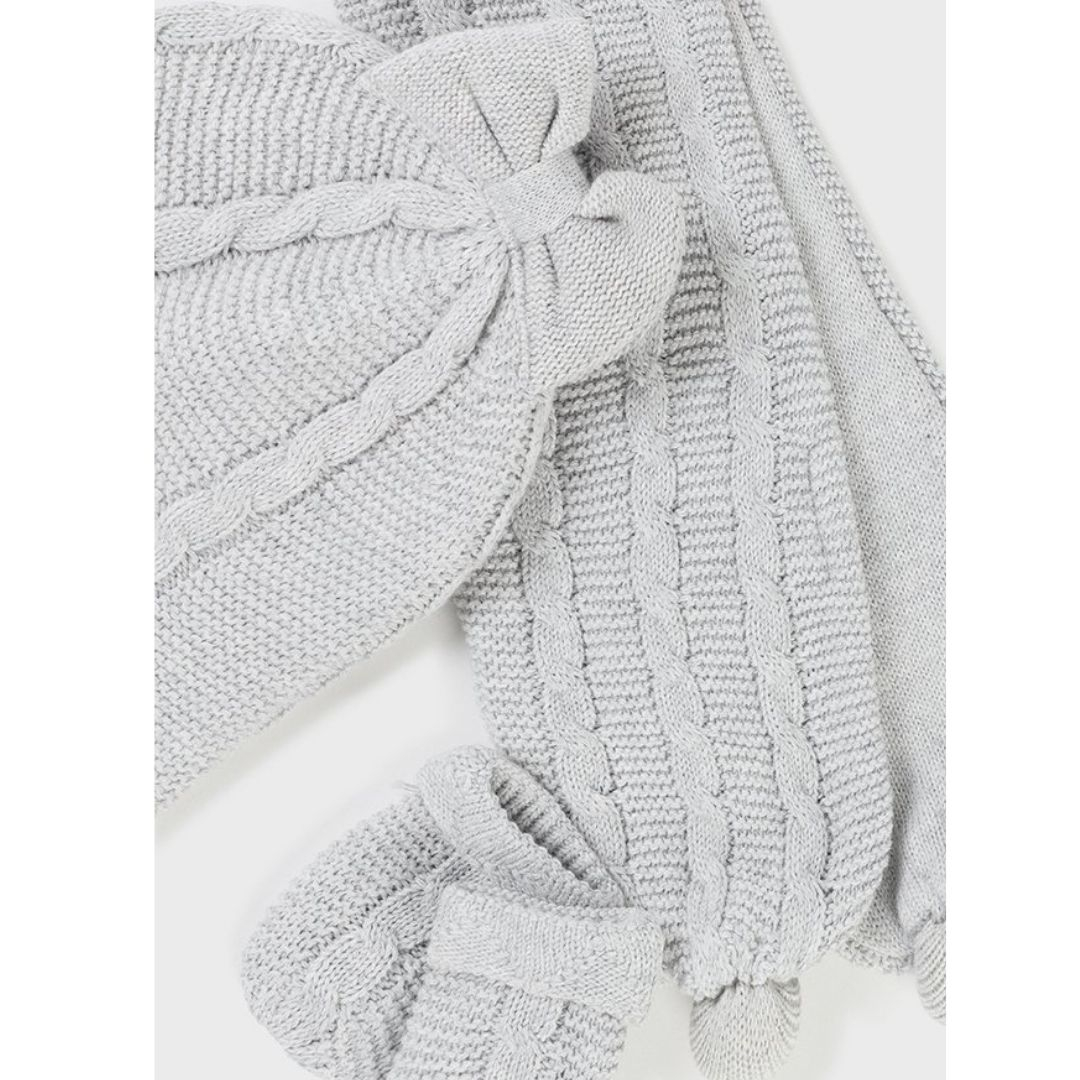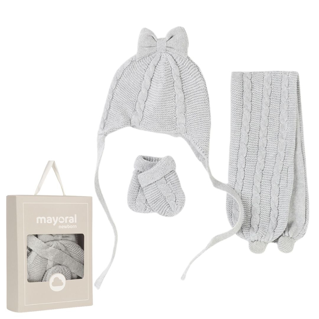 Set 3 piese Perla caciula fular si manusi - Mayoral Seturile vin ambalate elegant in cutie de carton Mayoral colectia New Born. Pot fi oricand oferite in dar la prima vizita sau daca doresti sa faci un cadou practic, util si cu stil.FularFular tricotat pentru bebelusi excelent in protejarea gatului atunci cand temperaturile incep sa scada. Un accesoriu nelipsit din dulap de toamna pana primavara . Fularul are ciucuri de ficare parte si are si un sitem de prindere.Material:Exterior