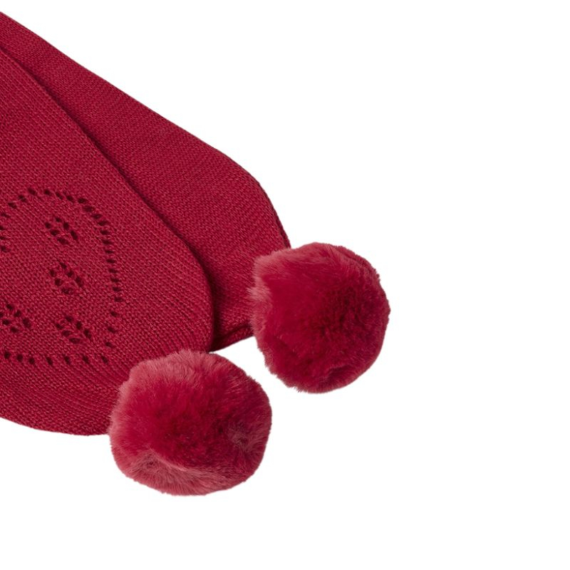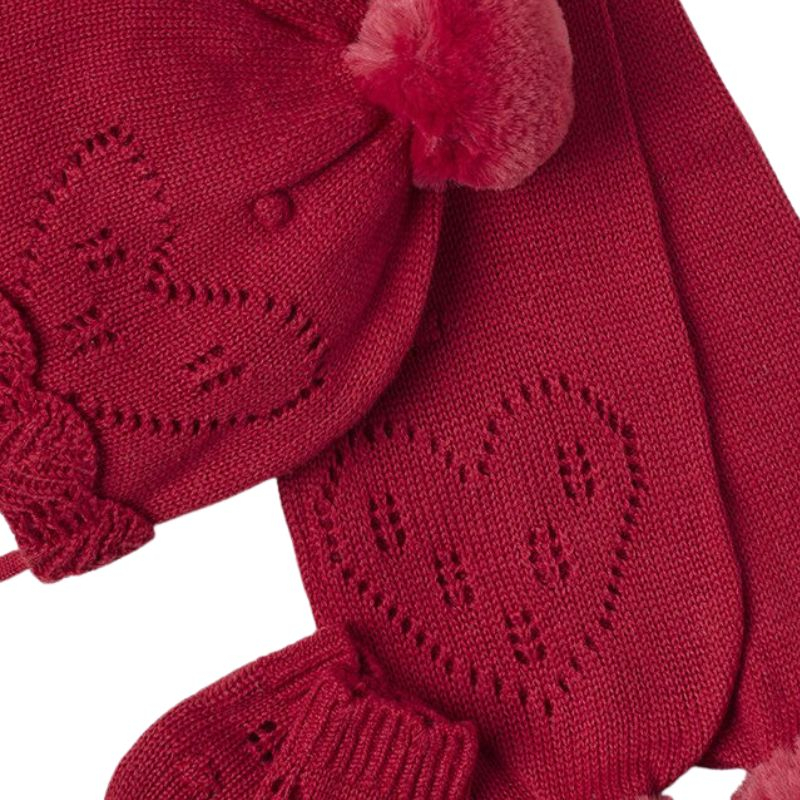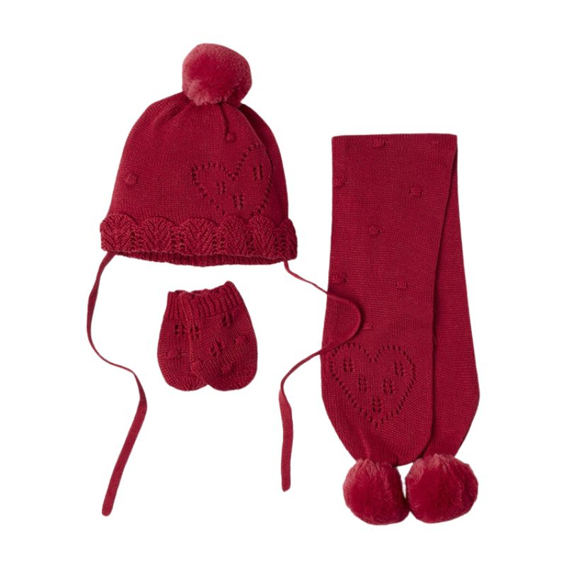 Set Rosu din 3 piese: caciula cu fular si manusi - Mayoral Seturile vin ambalate elegant in cutie de carton Mayoral. Pot fi oricand oferite in dar la prima vizita sau daca doresti sa faci un cadou practic, util si cu stil.FularFular tricotat pentru bebelusi excelent in protejarea gatului atunci cand temperaturile incep sa scada. Un accesoriu nelipsit din dulap de toamna pana primavara . Fularul are ciucuri mari de ficare parte si tricotajul formeaza spre capete cate o inimioara.Material:Exterior - 60% Bumbac 40% Fibre acriliceCăptuşeală - 60% Bumbac 40% Fibre acriliceCaciulitaCaciulita tricotata are acelasi model ca si fularul si manusile si se leaga sub barbie cu sireturi tricotate .Un ciucure mare in varf si inimioare tricotate completeaza modelul.Material:Exterior- 62% Bumbac 38% Fibre acriliceCăptuşeală - 60% Bumbac 40% Fibre acriliceManusiManusi tricotate fara degete cu acelasi model din set.Material: 60% Bumbac 40% Fibre acriliceCuloare: RosuIntretinere: Spalare: automata / manuala, cu detergent pentru rufe delicate
