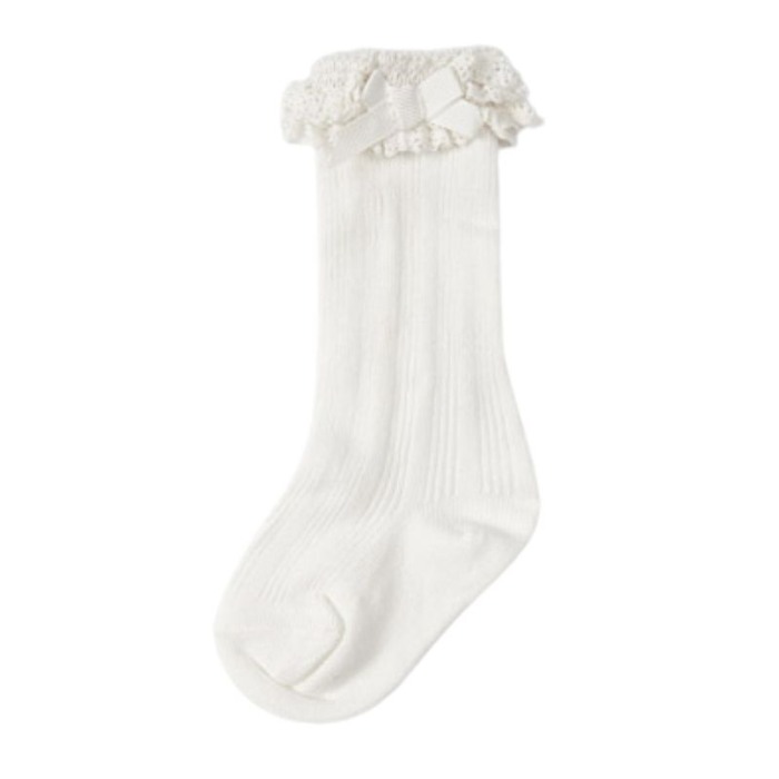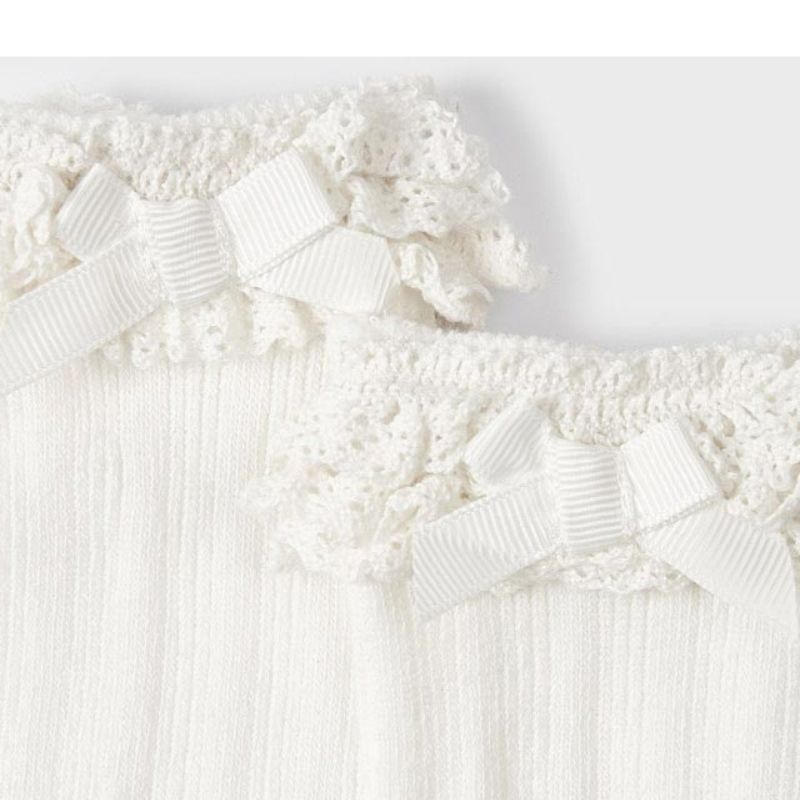 Sosete elegante lungi - Off white - Mayoral Este un accesoriu usor de combinat si versatil, fiind ideal pentru completarea oricarui look.Materialul este moale din bumbac elastic, avand un design cu volanase si fundite.Material: 74% bumbac / 23% poliester / 3% elastan