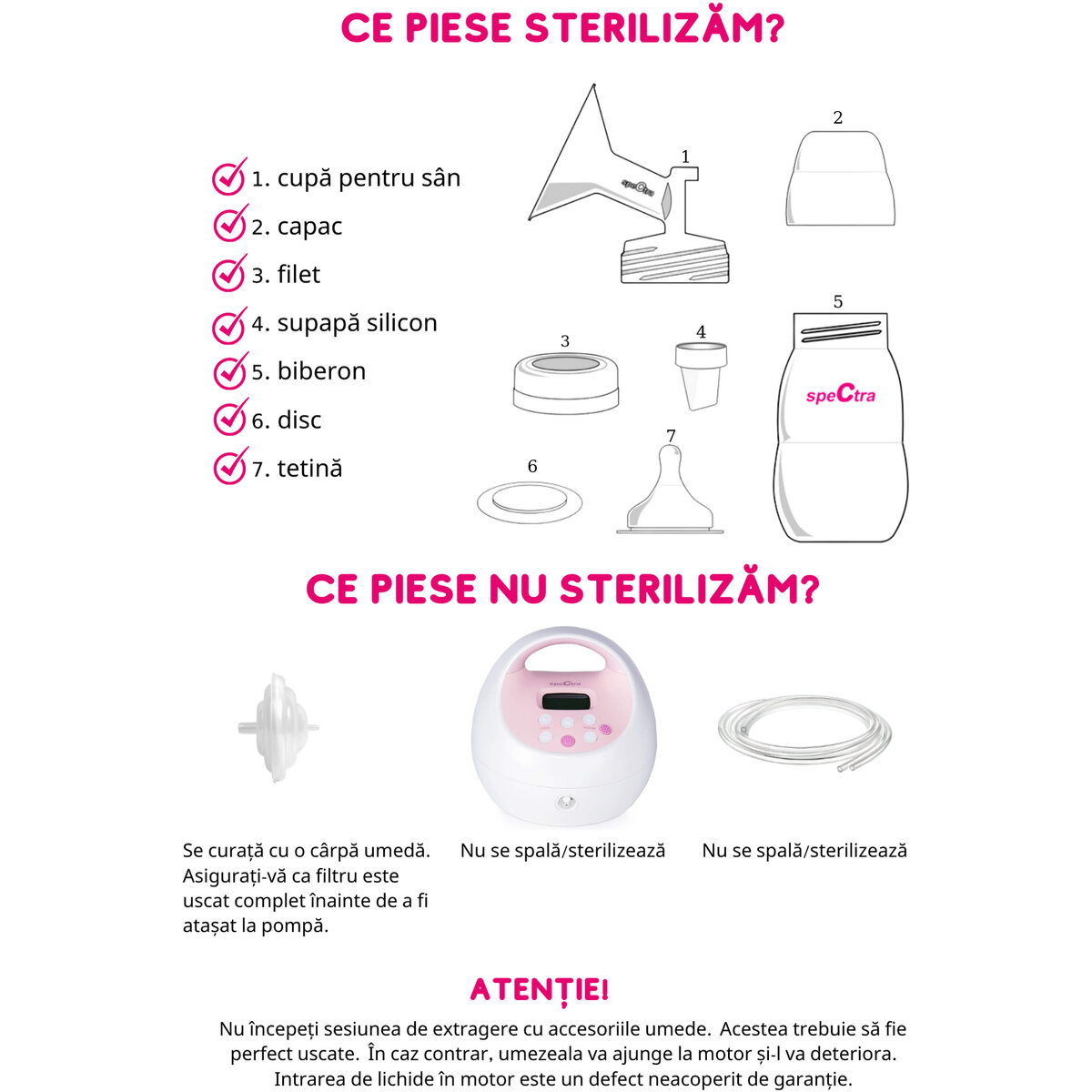 Atentie! Acest produs este un accesoriu pentru dispozitive medicale si nu intra sub incidenta O.U.G. 34/2014 art 3, alin 3, lit b, privind returul produselor. Componentele care intra in contact cu laptele trebuiesc sterilizate inainte de fiecare utilizare. Laptele matern poate fi stocat 72 de ore in frigider si pana la 3 luni in congelator. Laptele matern nu se incalzeste la microunde si nu se fierbe. Folosirea componentelor la mai multe persoane poate duce la transmiterea diverselor boli