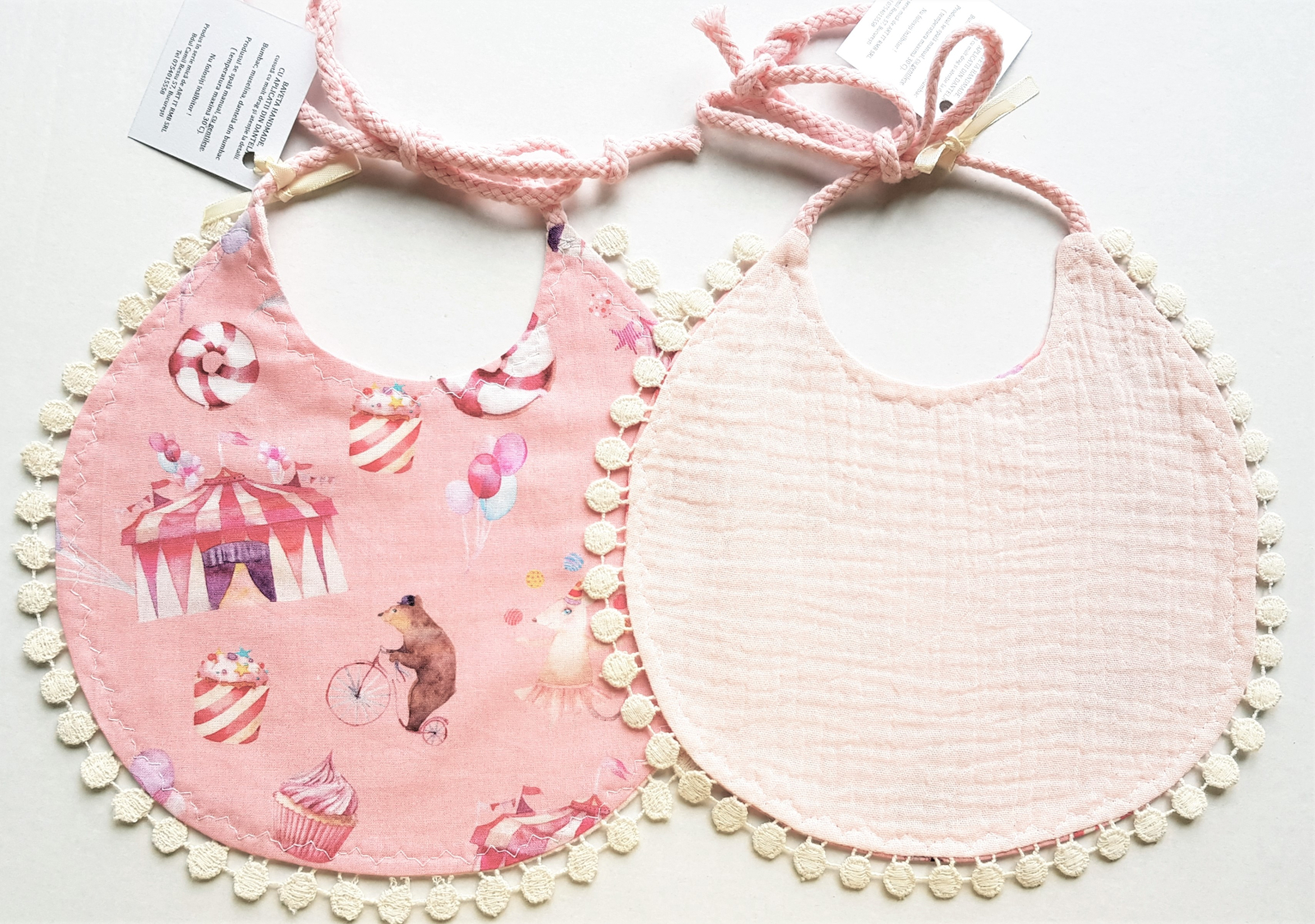 Baveta muselina fluturi, inimioare, steluteFrumoase si practice, aceste bavete lucrate din materiale naturale alese cu mare atentie, sunt accesorii absolut necesare in primele luni ale bebelusului. In perioada eruptiilor dentare sau cand incepi diversificarea, cu siguranta vei avea nevoie de ele.Si pot fi oricand un accesoriu chic pentru bebelusul tau. Baveta are doua fete: una de muselina si una din in si bumbac, cu dantela aplicata iar marginea este incadrata tot de o dantela fina de bumbac. Marime: 0 - 18 luniDimensiune: 22 cmMaterial: bumbacCuloare: rosu/ crem/albImprimeu: inimioare/fluturi/steluteIntretinere: Spalare: automata / manuala