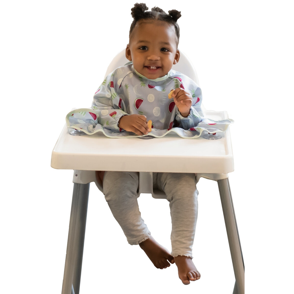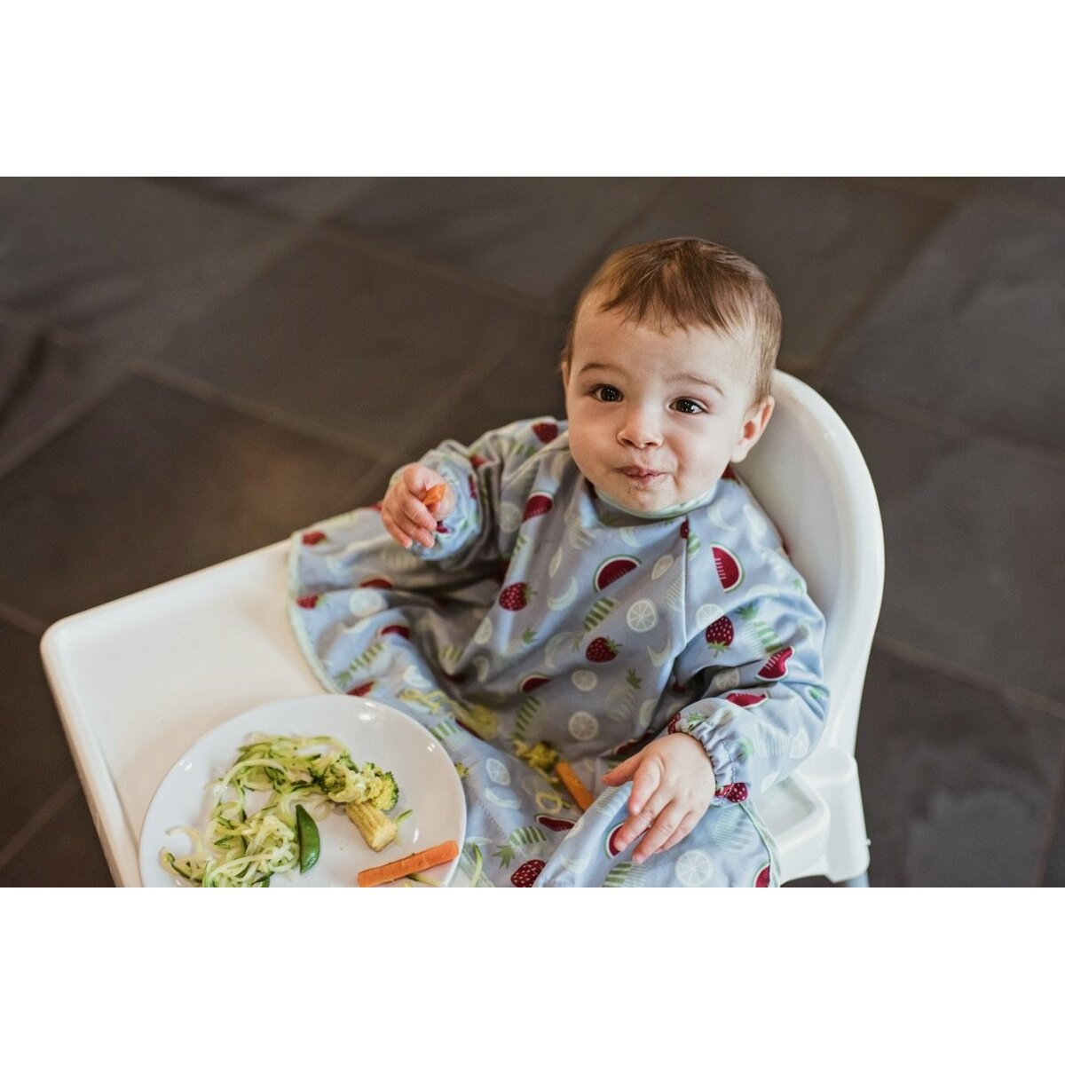 Baveta cu maneci si ventuze - FructeCand nu mai aveti nevoie in mod regulat de protectia completa oferita de kit-ul de hranire Tidy Tot, noua baveta lunga va deveni cel mai bun prieten al dvs.Pentru bebelusi si copii mici pana la 3 ani, aceasta baveta ofera protectie completa in timpul meselor si a sesiunilor de joc, fiind una dintre cele mai lungi bavete disponibile pe piata.