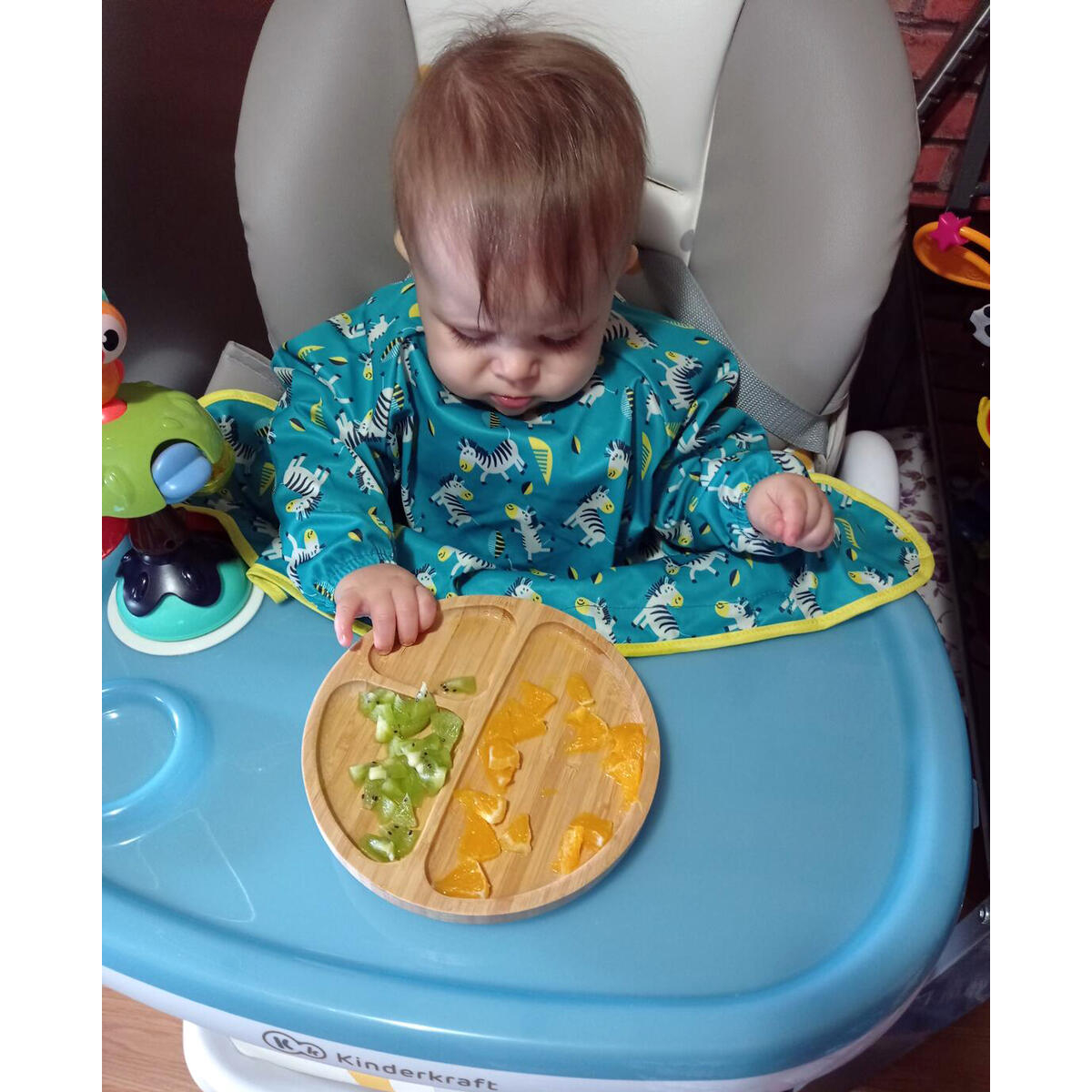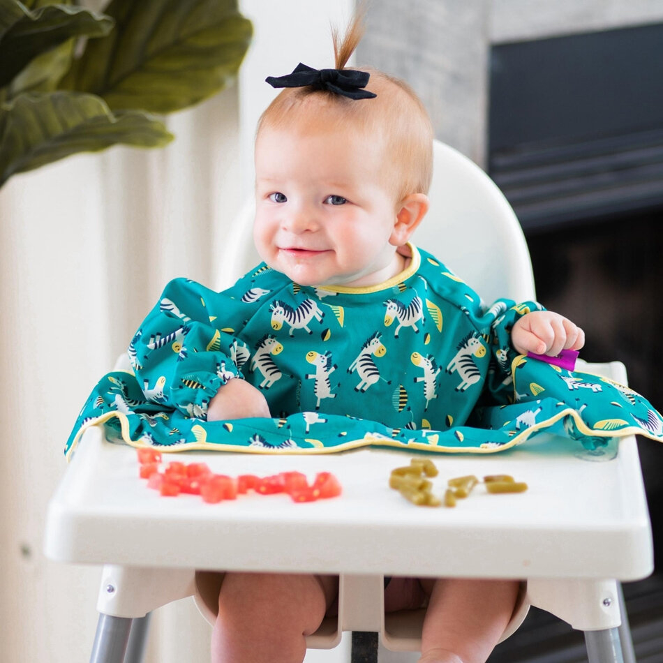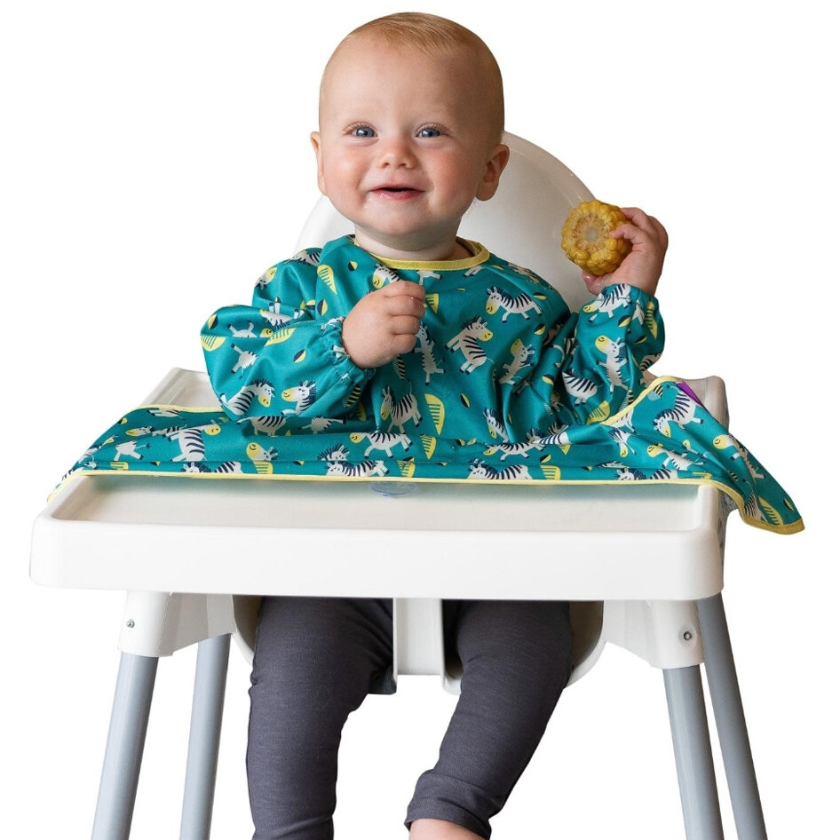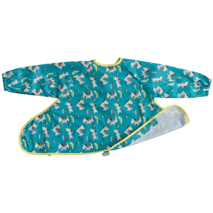 Baveta cu maneci si ventuze - Zebre veseleCand nu mai aveti nevoie in mod regulat de protectia completa oferita de kit-ul de hranire Tidy Tot, noua baveta lunga va deveni cel mai bun prieten al dvs.Pentru bebelusi si copii mici pana la 3 ani, aceasta baveta ofera protectie completa in timpul meselor si a sesiunilor de joc, fiind una dintre cele mai lungi bavete disponibile pe piata.