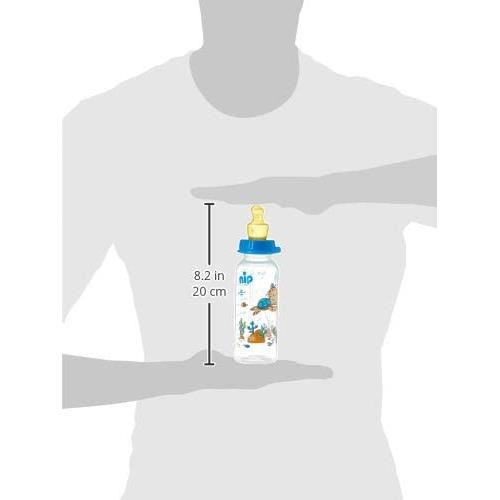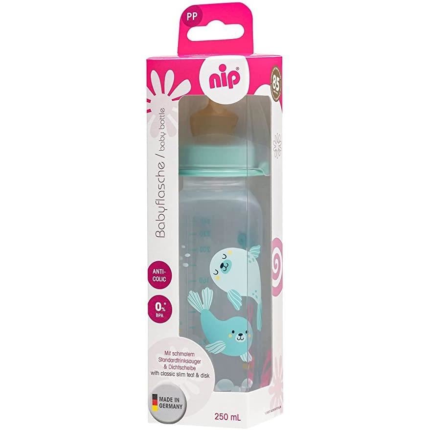 Sticluta biberonului are o capacitate de 250 ml si este confectionata din polipropilena necasanta de inalta calitate (PP), cu desene dragalase in culori vesele, fara BPA, fiind sigura pentru alimente. Marcajele clare de pe biberon asigura o masurare precisa pentru alimente.Tetina biberonului Nip este realizata din latex - un material natural de culoarea mierii, realizat din laptele arborilor de cauciuc. Extrem de rezistente la tragere si muscaturi datorita elasticitatii ridicate a latexului. In plus latexul este un material antistatic, nu atrage praful si puful.Un detaliu foarte important este si faptul ca tetina biberonului are o ventilatie eficienta anti-colici care permite aerului sa circule uniform in tetina, fara a permite acumulari de aer pe care bebelusul sa le inghita si apoi sa se baloneze.Datorita dimensiunilor sale, tetina este potrivita pentru bebelusi de la 6 luni, avand un orificiu de picurare mic potrivit pentru formula de lapte, iar forma anatomica ofera un supt confortabil pentru micut. Tetina se prinde etans pe biberon si nu permite picurarea sau scurgerea.Potrivit devizei sale „De la familii, pentru familii”, nip® este cel mai vechi producator de suzete din Germania si a castigat increderea clientilor sai in ultimii 90 de ani prin standardele ridicate de calitate si produsele sale inteligente. Familiile multumite si bebelusii fericiti au prioritate pentru nip®, la fel ca produsele sigure, functionale si de inalta calitate.Specificatiile produsului:• Biberon gradat din polipropilena de capacitate 250 ml, usor si necasant,• Tetina anatomica, de forma ortodontica, din latex natural, cu aerisire anti-colici ce impiedica inghitirea aerului si asigura un flux constant de lichid,• Inelul de etansare foarte gros al tetinei asigura o potrivire optima, fara picurare, pe gatul biberonului,• Tetina de marimea 2 (de la 6 luni) cu orificiu de curgere subtire pentru formula de lapte – cu debit mediu (M),• Marcaje clare pe biberon, ce asigura o masurare precisa pentru alimente,• Biberon compatibil cu toate tetinele nip® pentru biberoane standard,• Material polipropilena (PP) de inalta calitate, placut la atingere, sigur pentru alimente,• Design cu motive vesele,• Lavabil in masina de spalat vase,• Fabricate 100% in Germania, din materiale de inalta calitate, fara BPA,• Certificat in conformitate cu standardul de siguranta EN 14350.