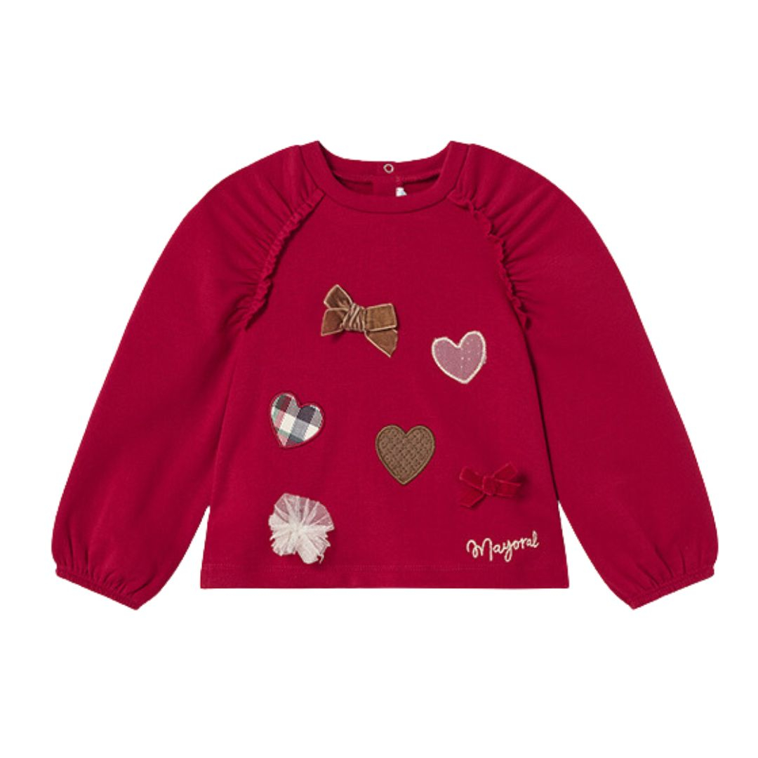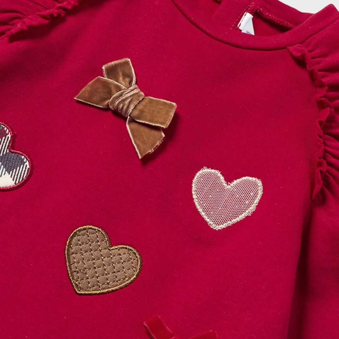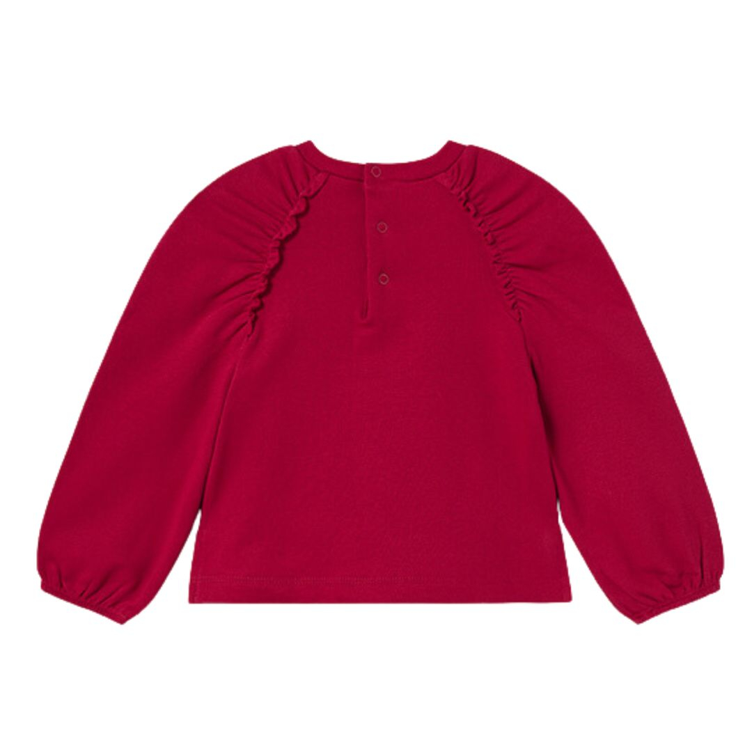 Bluza cu volanas - Iepuras Bluza cu maneca lunga are mansete elastice si guler rotund. Inchiderea se realizeaza cu capse pe partea posterioara pentru a usura imbracarea copilului.Material: 94% Bumbac 5% Elastan 1% Poliester Culoare: rosuDesign: inimioare aplicate si brodate + findita catifeaIntretinere: Spalare: automata / manuala, cu detergent pentru rufe delicate