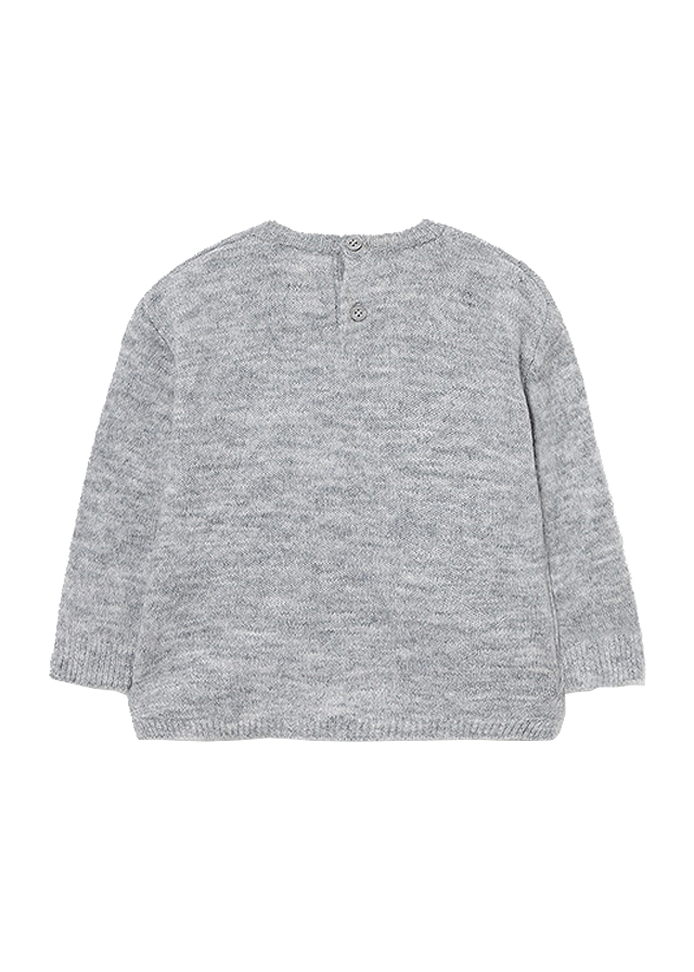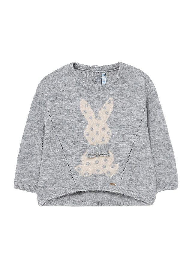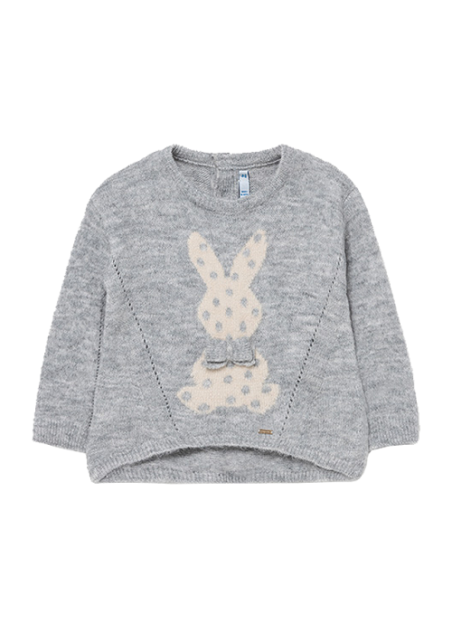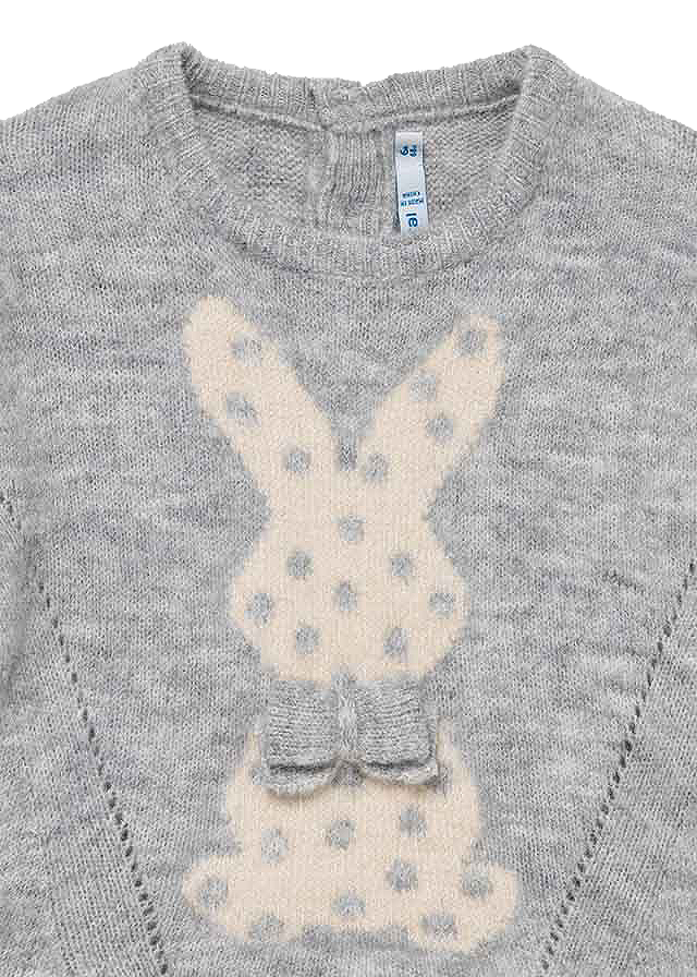 Pulover aplicatie - IepurasPuloverul cu maneca lunga, are gulerul rotund si inchidere cu nasturi pe spate pentru a facilita imbracarea copilului. Design cu tiv asimetric.Material: 74% fibre acrilice / 22% poliester / 4% elastanCuloare: griImprimeu: iepure Intretinere: