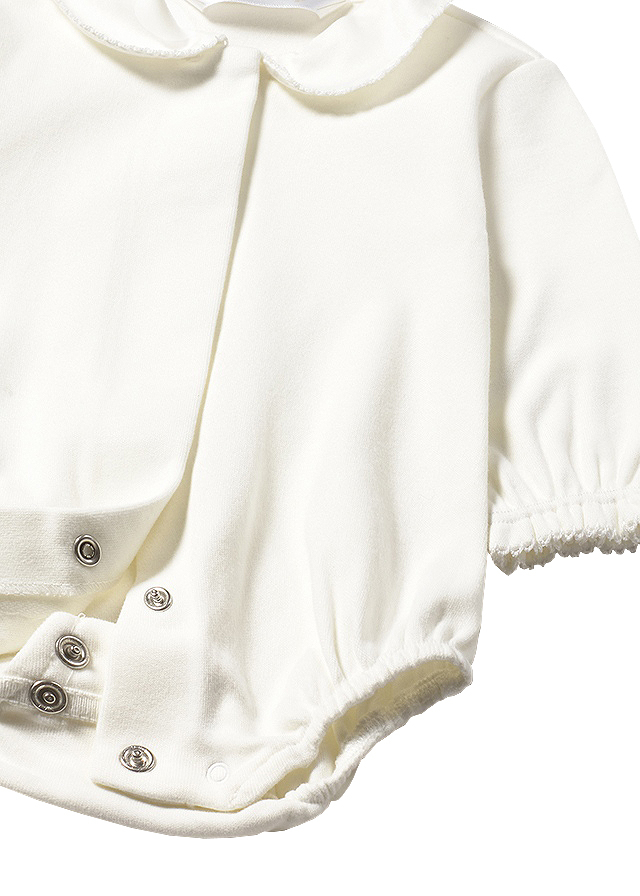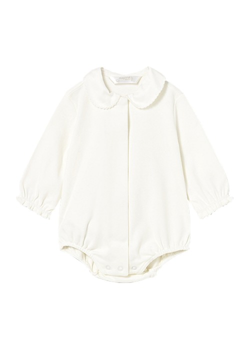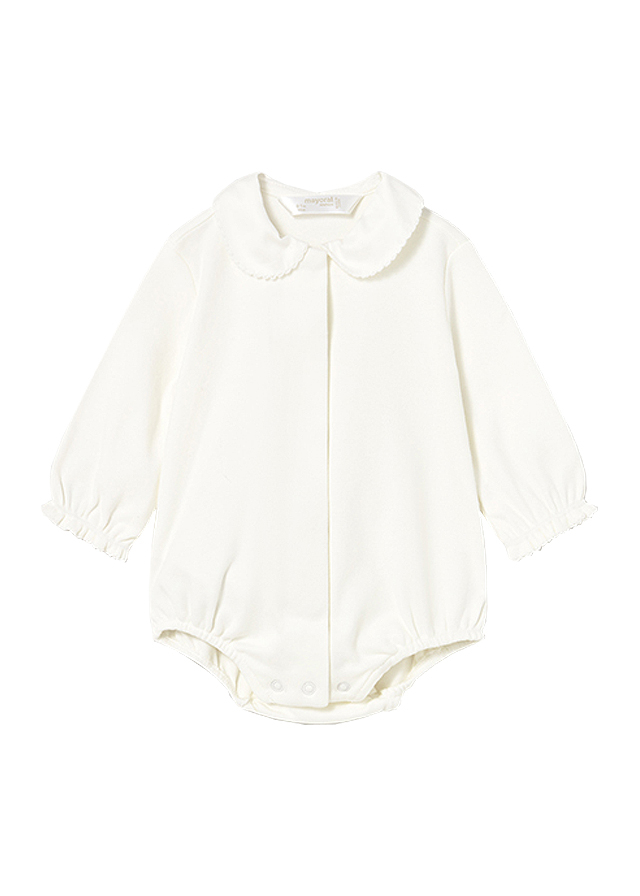 Body cu guler - ecru Body-ul are maneci lungi bufante si gulerul rotund tip camasa. Inchiderea se face cu capse pe fata si 3 capse in partea de jos, pentru o imbracare usoara.