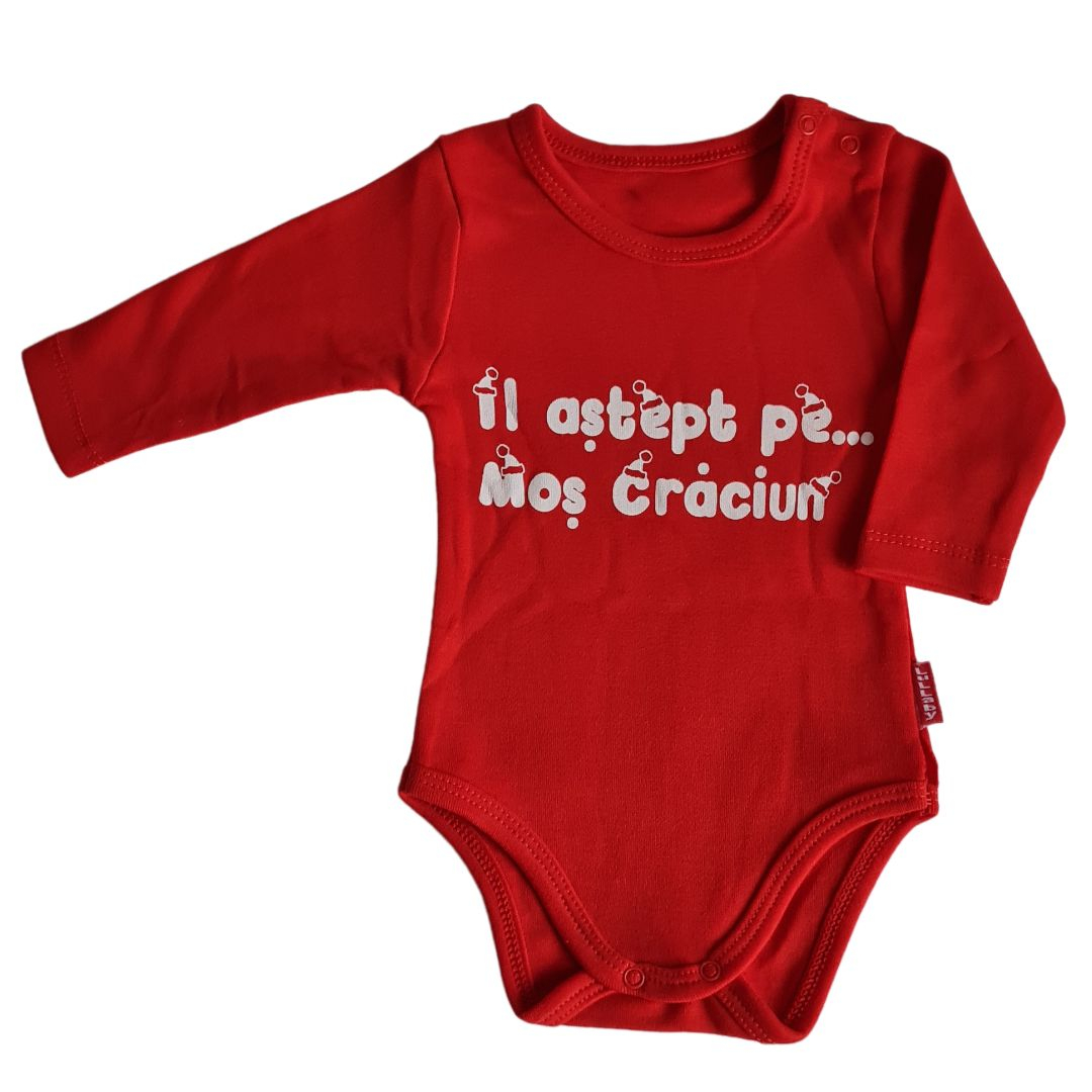 Body cu maneca lunga - Il astept pe Mos CraciunBody-ul se prinde cu cate doua capse pe umar iar in partea de jos cu alte doua capse.Bebe va fi incantat sa poarte un astfel de body haios in zi de sarbatoare!