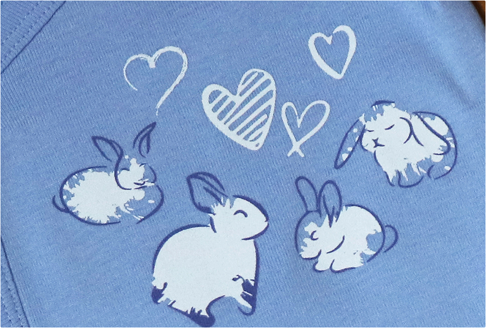 Culoare: bleu /albImprimeu: iepurasi / dungi Spalare: automata / manuala