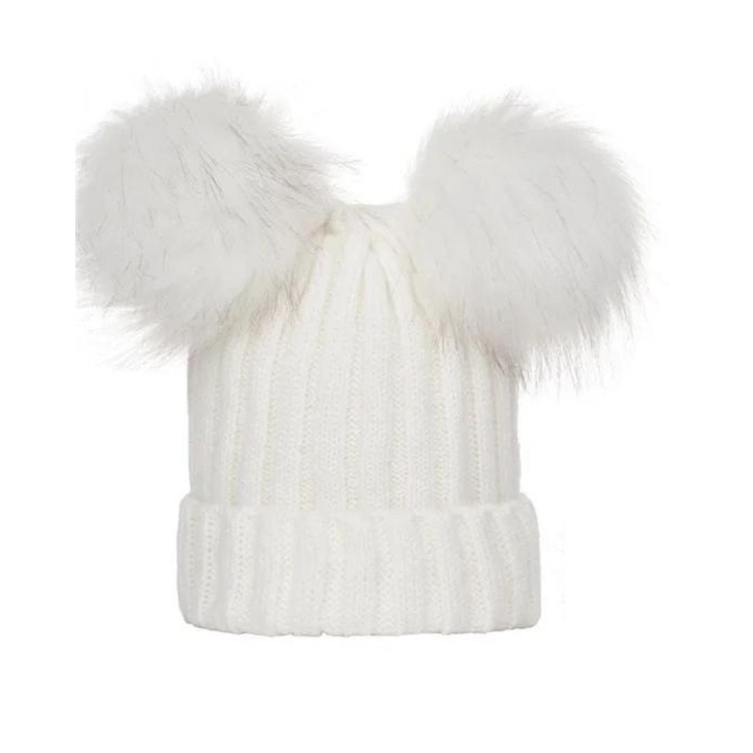 Caciulita alba cu 2 ciucuri - Drool Caciula tricotata cu 2 ciucuri din blanita este moale la atingere călduroasa. Ciucurii sunt din blanita artificiala si au tot culoarea alba pudrati cu gri.Culoare:albMarime: masura este universala, pentru copii intre 1 an si 3 ani.Material: tricotIntretinere: Spalare: automata / manuala, cu detergent pentru rufe delicate