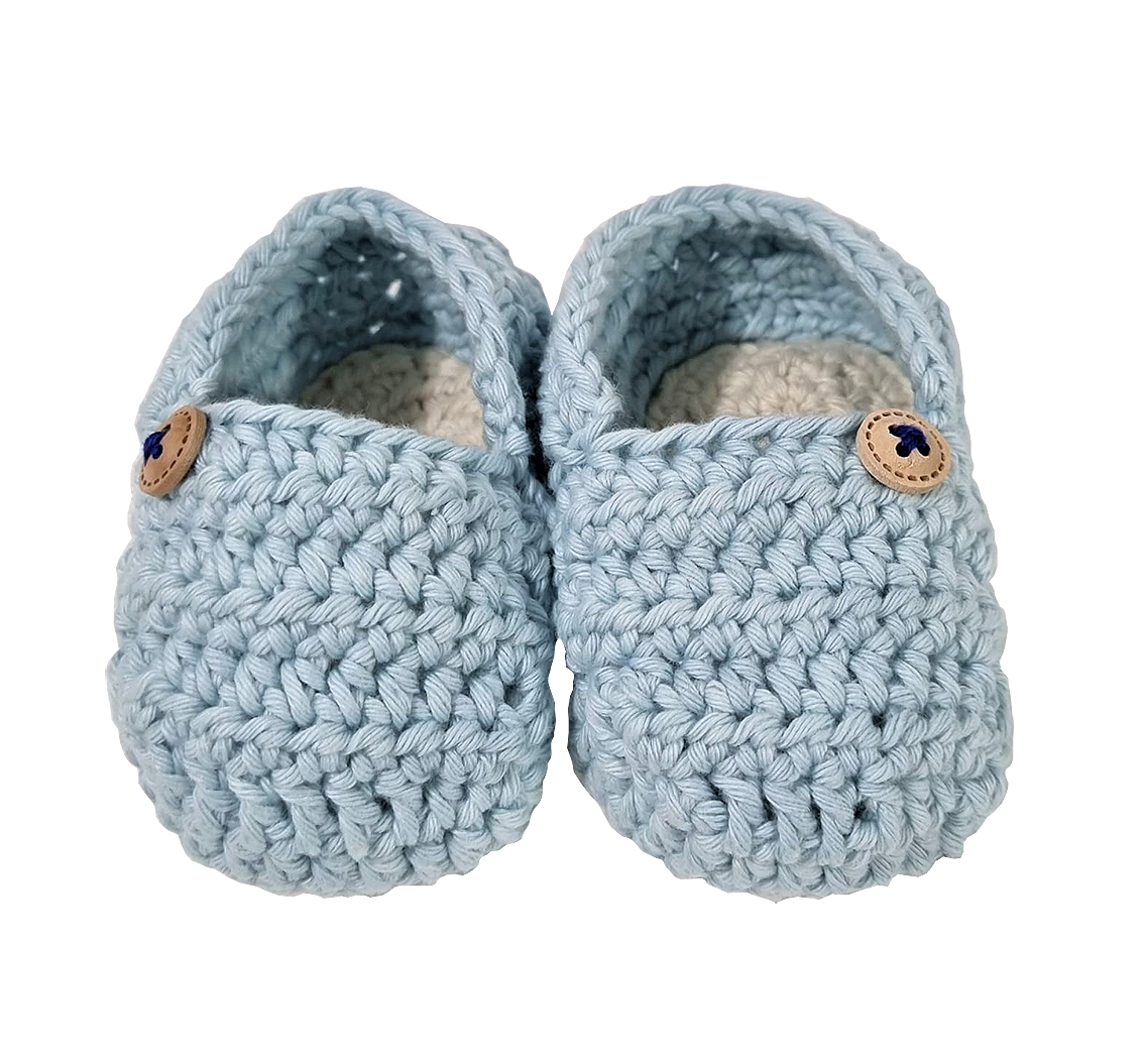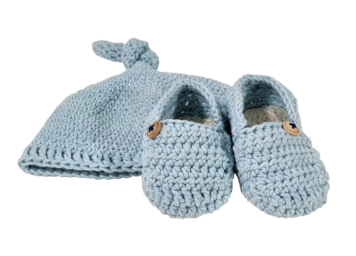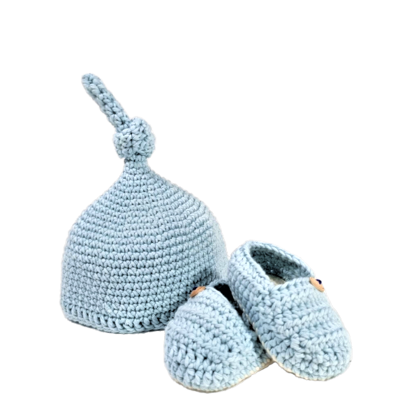 Acestia sunt crosetati cu aceeasi migala si drag, unde cei mici nu vor simti frigul, fiind moi si caldurosi. Au ca detaliu un nasture mic cusut.Material: 100% bumbacVarsta: 0 - 3 luniCuloare: bleu griLa comanda se pot croseta si alte masuri.Intretinere:Spala hainele in apa calduta (pana la 30°C) si nu le expune niciodata la caldura directa.
