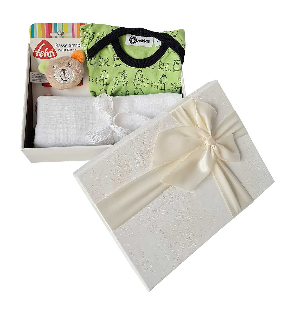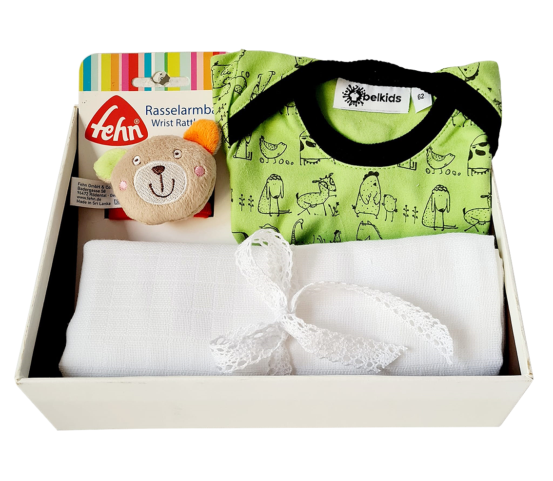 Cadou bebelus - Zornaitoare ursulet - BestfamAtunci cand vrei sa faci un cadou inedit, dar si util in acelasi timp bebelusului, poti avea incredere in alegerile noastre.BESTFAM va propune acest cadou pentru bebelusi.Am selectat din magazinul nostru, mai multe lucruri utile si simpatice de o calitate excelenta, toate asezate intr-o cutie de carton alb-crem.La solicitarea dvs. se poate inlocui cutia si cu alt ambalaj (cos din nuiele, panza, cutii de carton) sau se pot ambala in hartie pentru cadouri.Mamicile se vor bucura de acest cadou inspirat, deoarece combinatiile si masurile produselor sunt alese cu grija, fiind necesare inca de la iesirea din maternitate, dar si in lunile urmatoare.Este un cadou simpatic, unic, gata pregatit pentru tine, ce te salveaza atunci cand nu ai timp sa gasesti ceva potrivit pentru un bebelus.Cadoul cuprinde: - body cu maneca lunga - scutec refolosibil - bratara zornaitoare - cutie cadouDetalii produseBody cu mancea lunga - Animale domestice - BelkidsBody-ul este fabricat din bumbac organic avand pe margini o banda foarte putin elastica pentru a-i conferi stabilitate. Se incheie in partea de jos cu trei capse, fiind practic in toate anotimpurile.Material: Bio Cotton 215 gr (95% bio cotton + 5% elastan)