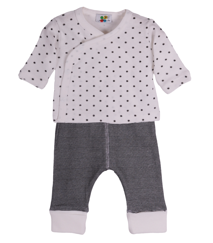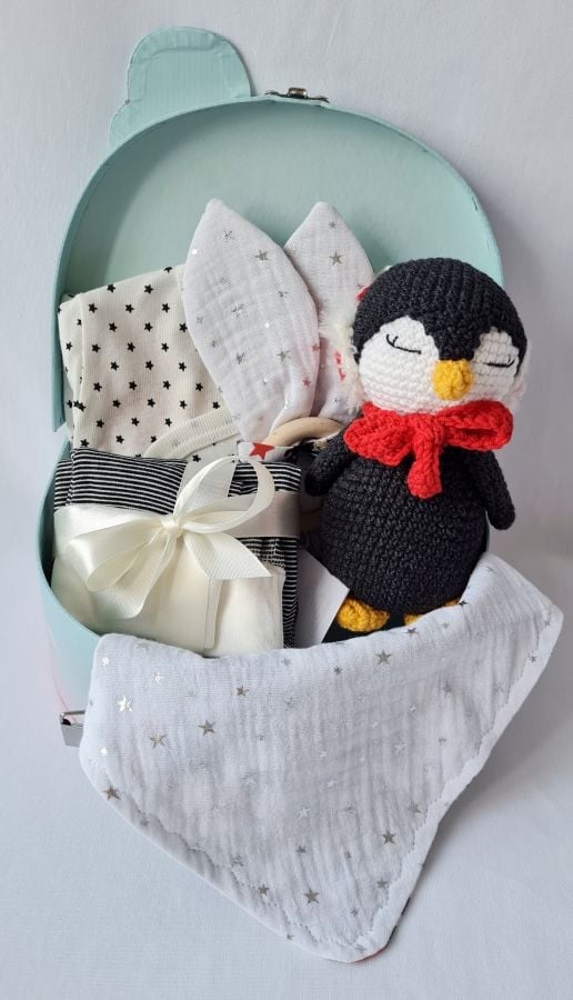 Cadou bebelusi - Pinguin negruAtunci cand vrei sa faci un cadou inedit, dar si util in acelasi timp bebelusului, poti avea incredere in alegerile noastre.BESTFAM va propune acest cadou pentru bebelusi.Am selectat din magazinul nostru, mai multe lucruri utile si simpatice de o calitate excelenta, toate asezate intr-o cutie de carton alb-crem.La solicitarea dvs. se poate inlocui cutia si cu alt ambalaj (cos din nuiele, panza, cutii de carton) sau se pot ambala in hartie pentru cadouri.Mamicile se vor bucura de acest cadou inspirat, deoarece combinatiile si masurile produselor sunt alese cu grija, fiind necesare inca de la iesirea din maternitate, dar si in lunile urmatoare.Este un cadou simpatic, unic, gata pregatit pentru tine, ce te salveaza atunci cand nu ai timp sa gasesti ceva potrivit pentru un bebelus.Cadoul cuprinde: - compleu 2 piese (pantaloni si bluza) - baveta - inel dentitie - jucarie tricotata - cutie cadouDetalii produseCompleu 2 piese - By DaninaCompleul contine: