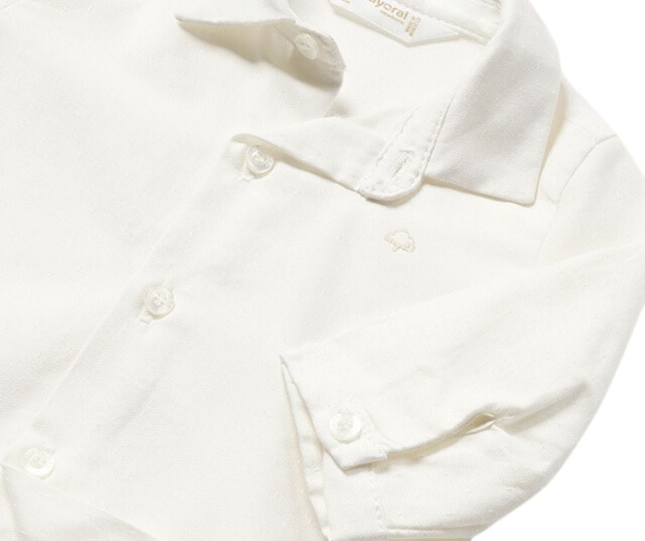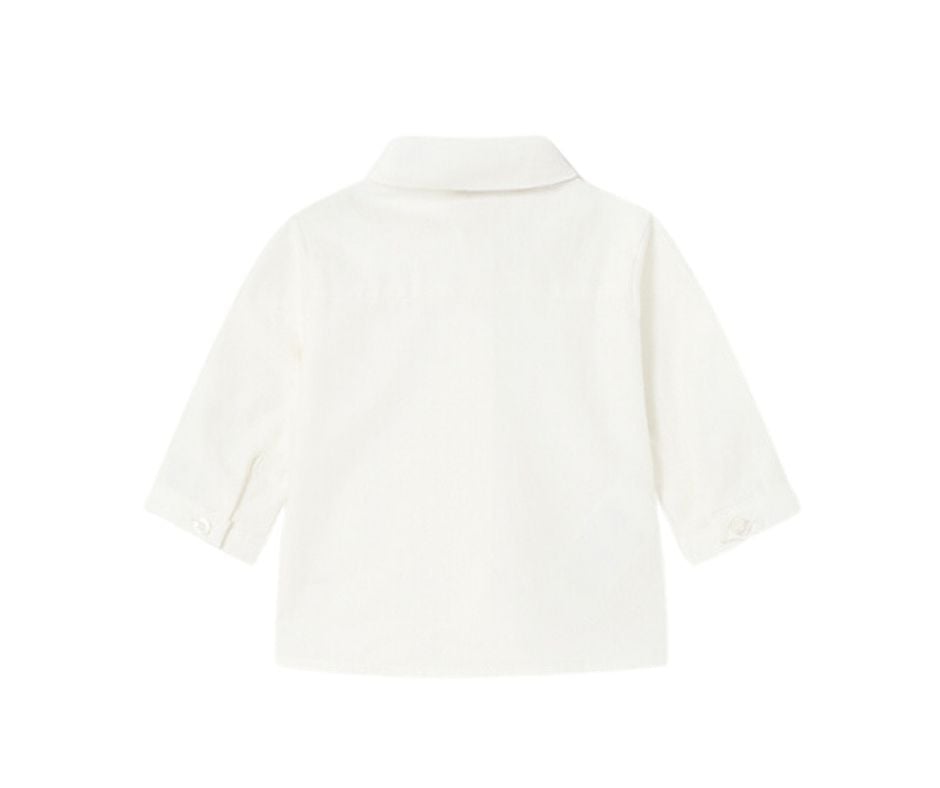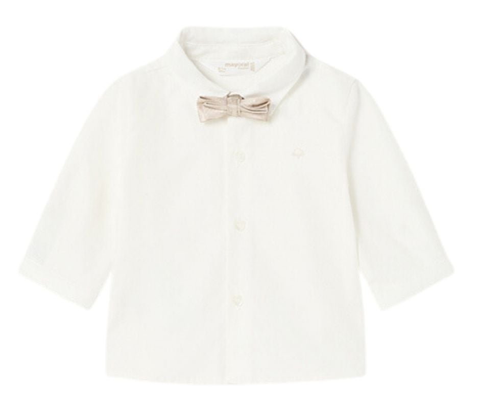 Camasa alba cu maneca lunga + papion bejCamasa cu maneca lunga si mansete cu nasturi pentru bebe nou-nascut. Camasa are guler clasic si vine la pachet cu un papion elastic si reglabil. Inchiderea camasii se face cu nasturi, pe partea din fata.Papion elegant are inchiderea reglabila, pentru o mai buna ajustare pe gat. Designul cu imprimeu picatele, ii da o nota de eleganta, papionului.