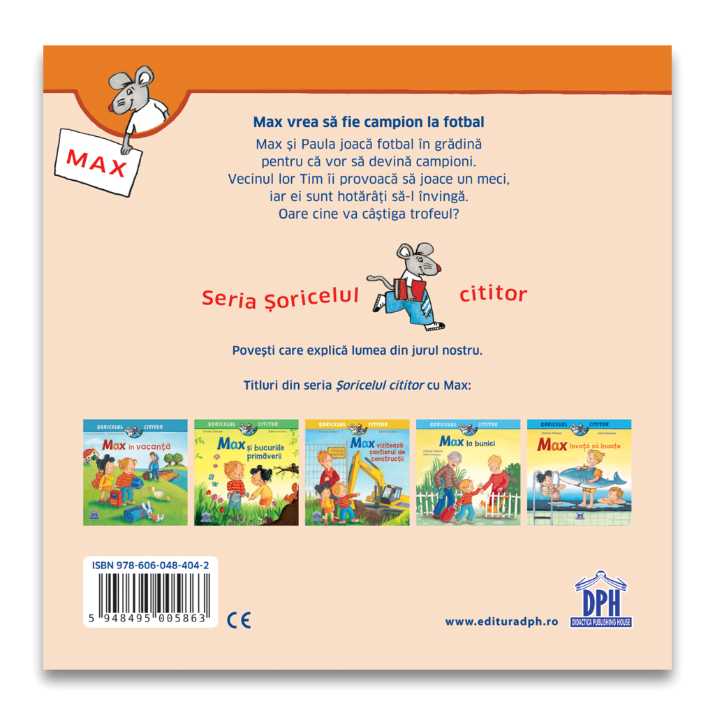 Max vrea să fie campion la fotbal face parte din seria Șoricelul cititor – povești care explică lumea din jurul nostru și oferă un divertisment extraordinar micilor fani ai fotbalului cu vârsta peste 3 ani.
