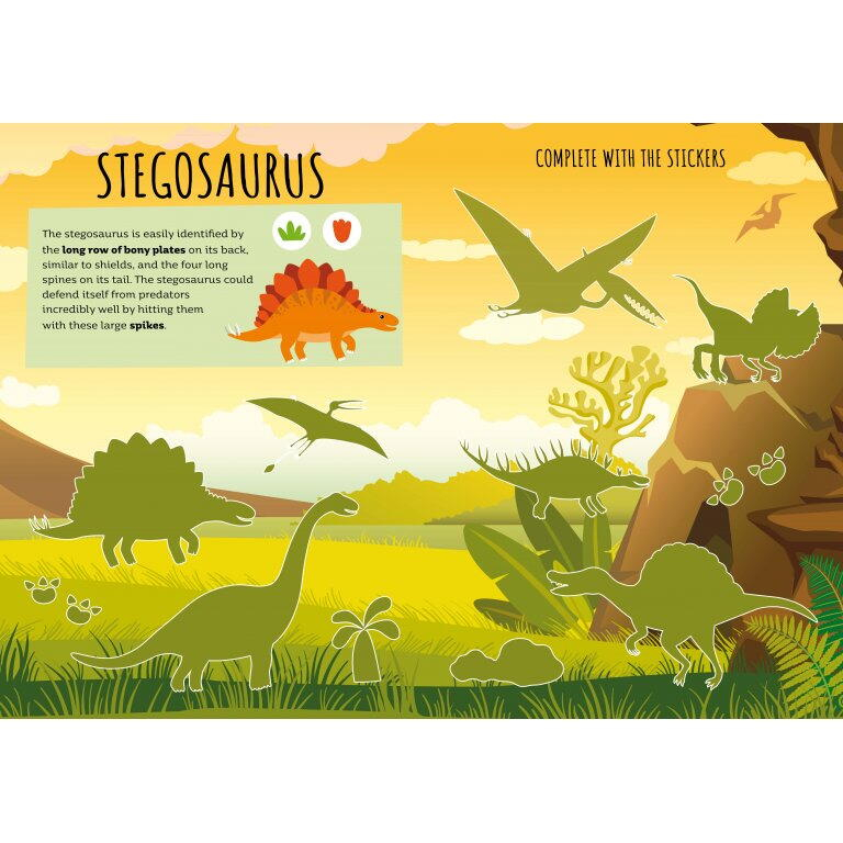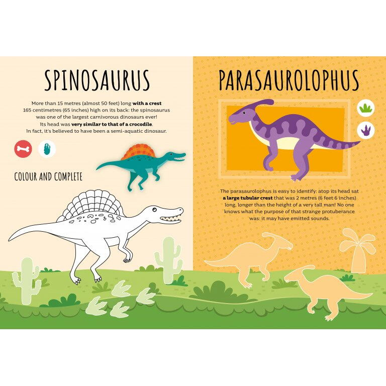 In interiorul cartii veti descoperi: pagini de colorat cu cei mai indragiti dinozauri, pentru a stimula creativitatea si expresivitatea artistica, labirinturi ingenioase, menite sa dezvolte gandirea logica si orientarea in spatiu, zeci de abtibilduri reutilizabile, perfecte pentru jocuri interactive si activitati de asociere si multe informatii amuzante si interesante despre viata dinozaurilor, adaptate varstei celor mici