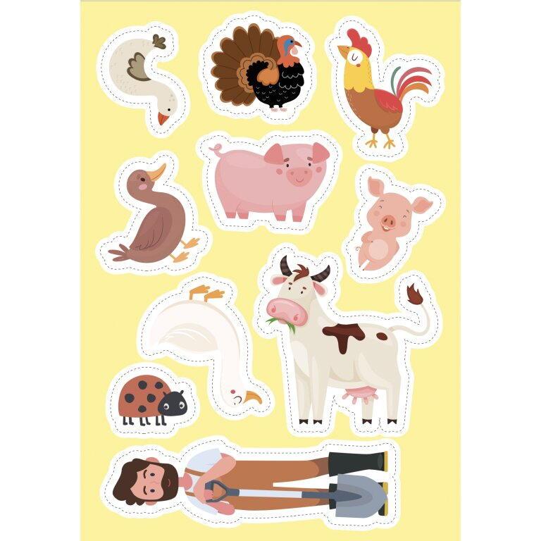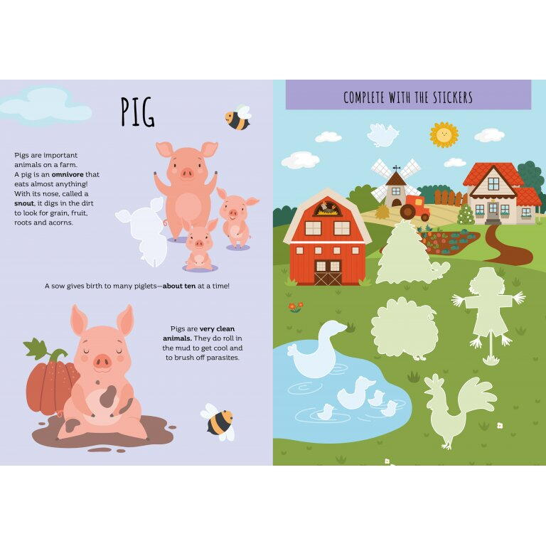 Cartea contine: pagini de colorat cu animale de ferma, tractoare, hambare si alte elemente specifice, menite sa incurajeze exprimarea artistica si atentia la detalii, labirinturi captivante, care pun la incercare logica, rabdarea si spiritul de observatie, 60 de abtibilduri colorate, ideale pentru completarea activitatilor si pentru a stimula coordonarea mana-ochi, jocuri de atentie si cu umbre si multe informatii interesante si accesibile despre animalele de ferma, culturi agricole si munca fermierilor – toate adaptate pentru intelegerea copiilor mici