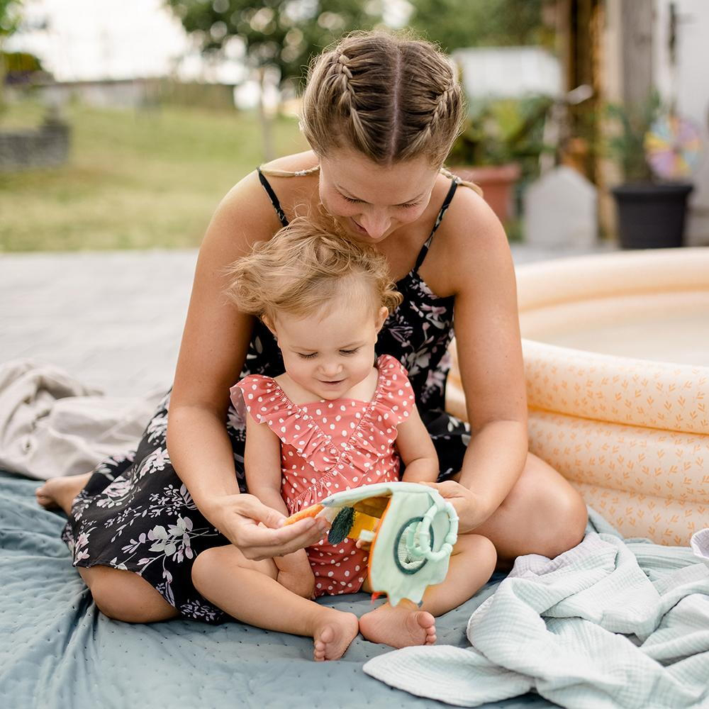 materialul moale si impermeabil, placut la atingere, culorile vii si imaginile, precum si oglinjoara ii vor capta atentia pentru un timp indelungat