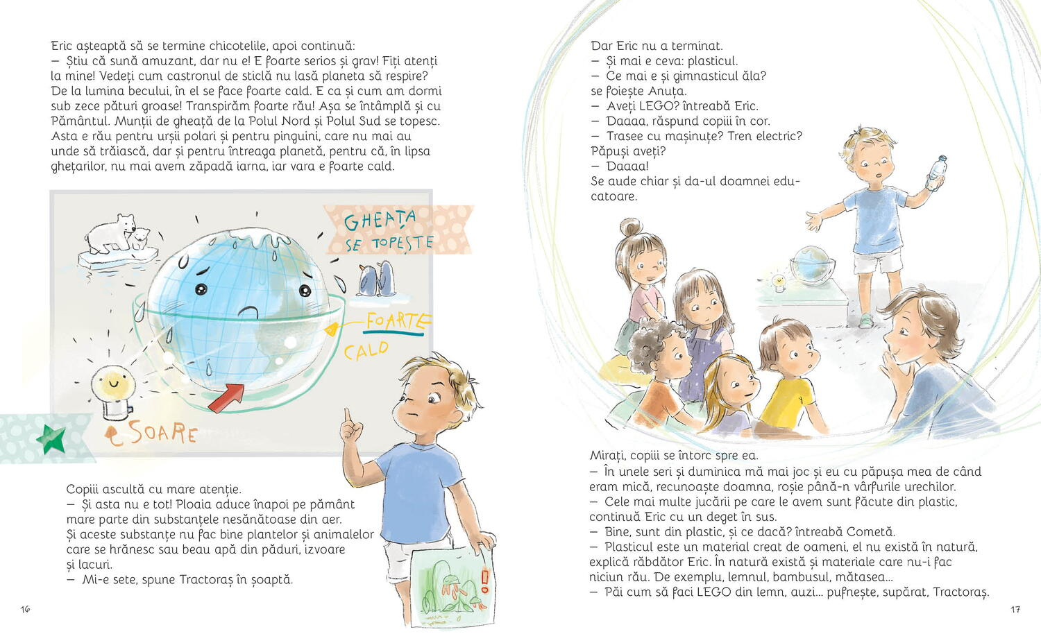 In aceasta aventura plina de umor si invataminte, Ema si Eric descopera impreuna cat de mult rau putem face naturii daca nu suntem atenti, dar si cum poate actiona fiecare dintre noi, oricat de mic ar fi, pentru a proteja de poluare Pamantul. Dupa o intamplare neasteptata de ziua lui, Eric intelege mai bine cata nevoie are Pamantul de protectia noastra! Apoi, micul nostru prieten le explica tuturor colegilor de la gradinita in ce mod polueaza oamenii Planeta. De la cei doi pofticiosi vom afla și care sunt cele noua lucruri simple, dar foarte importante, despre reciclare, economisire si curatenie pe care le putem face toti pentru marea noastra casa, planeta Pamant!
