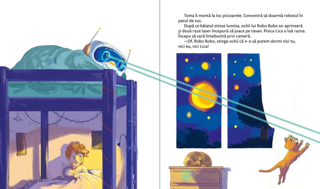 Nastrusnicul Robo Bobo, robotul dependent de ciocolata, trebuie sa mearga la culcare. Dar nu poate sa adoarma si nu-l lasa nici pe copil sa doarma. Nici pe biata pisica! Are lasere in ochi, carti de joc in sertarasul secret, iar cand sa numere oi, face un adevarat taraboi! Dar maine e prima zi de scoala si copilul trebuie sa se odihneasca.Hmm... ce e de facut? Cum se adoarme un robot neascultator?