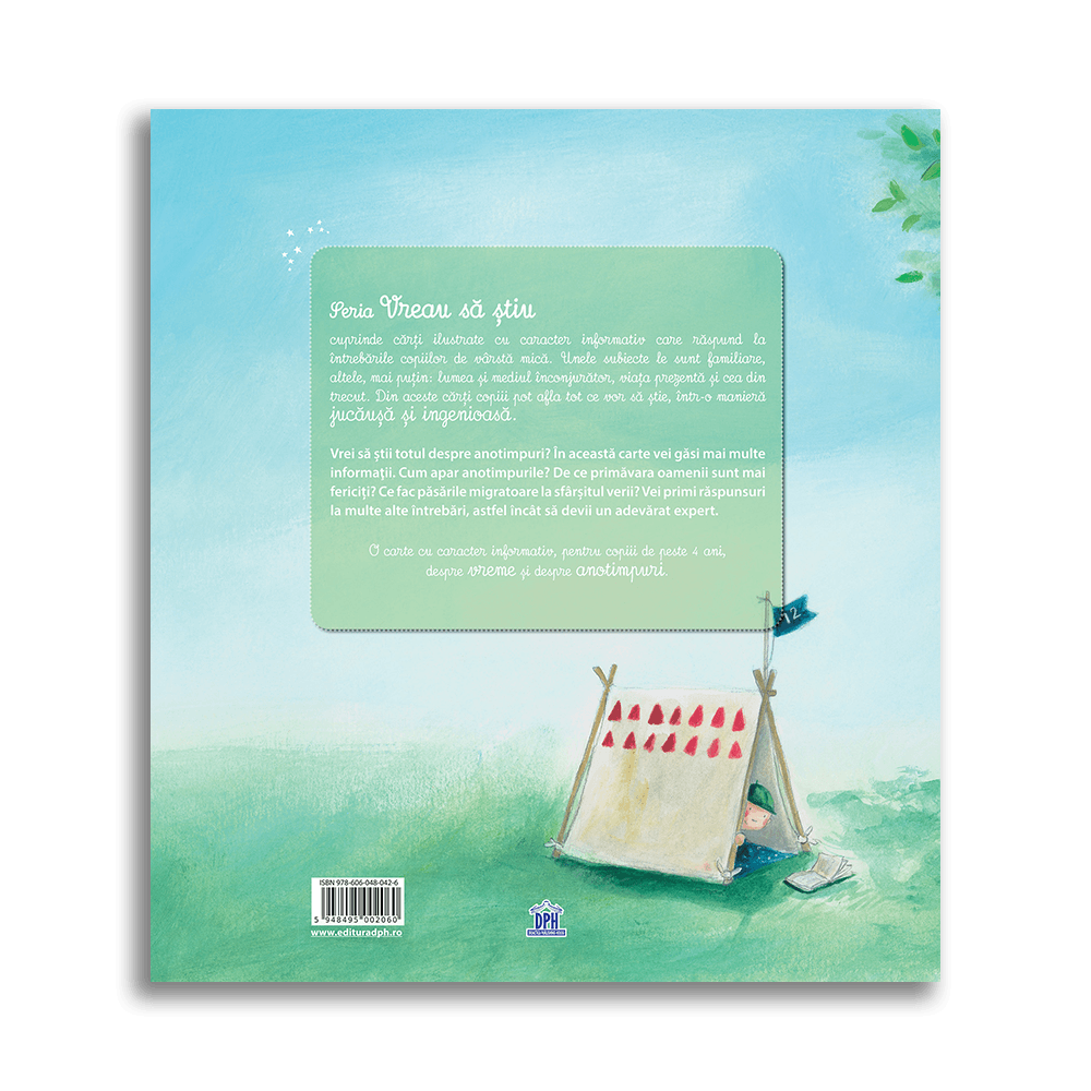 Vrei sa stii totul despre anotimpuri? In aceasta carte vei gasi mai multe informatii. Cum apar anotimpurile? De ce primavara oamenii sunt mai fericiti? Ce fac pasarile migratoare la sfarsitul verii? Vei primi raspunsuri la multe alte intrebari, astfel incat sa devii un adevarat expert.