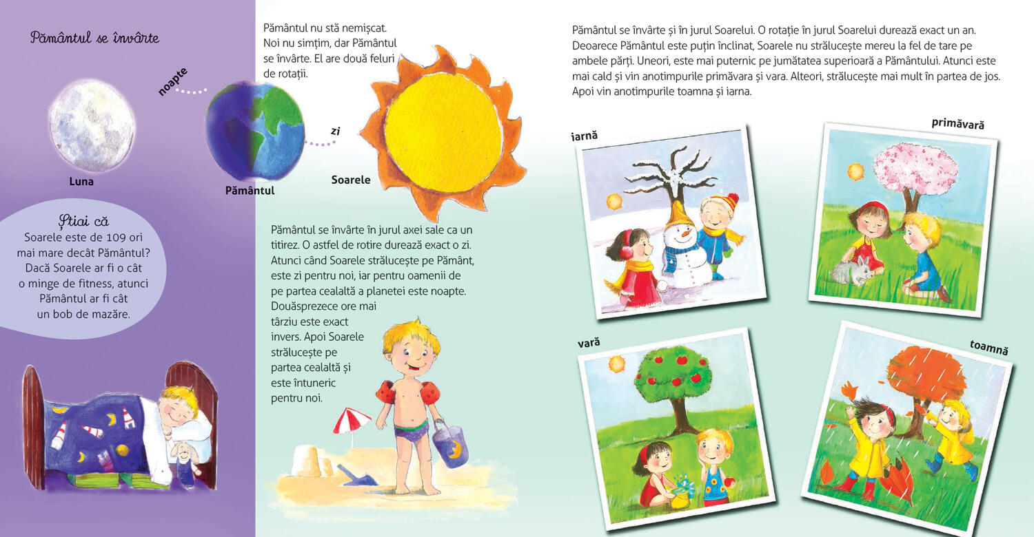 Noua carte din seria DPH -Vreau sa stiu cuprinde numeroase raspunsuri la multe intrebari precum: ""Vrei sa stii totul despre Soare, Pamant si Luna?"", ""De ce este intuneric noaptea si de ce este lumina ziua?"", ""Cine traieste pe Pamant?"", ""De ce este mai frig iarna decat vara?"", ""Putem calatori pe Luna?"", ""Este cald pe Soare?"".