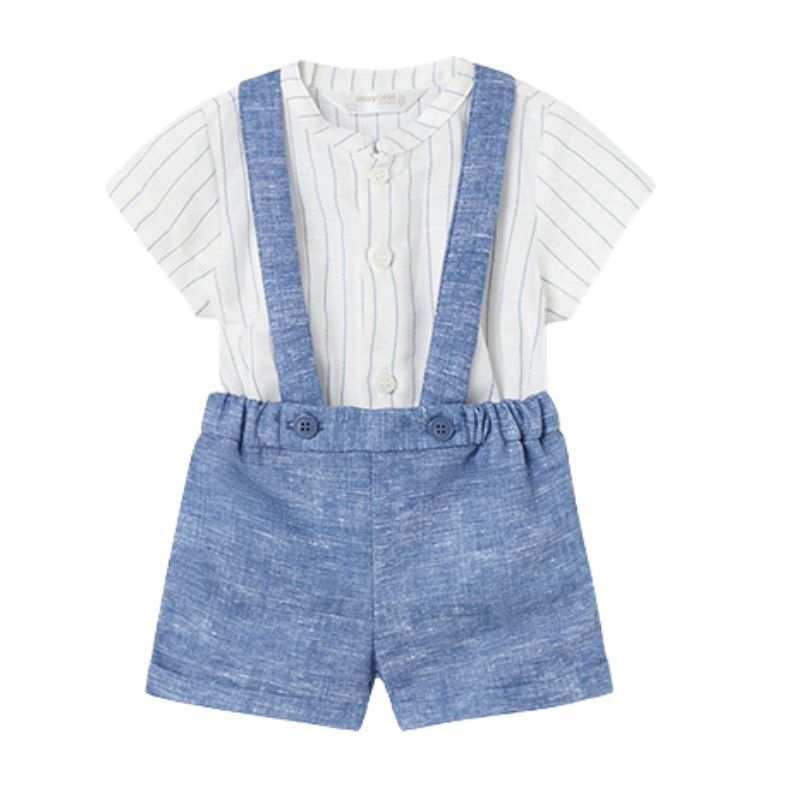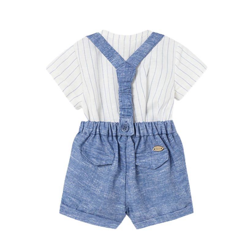 Pantalonasi scurti tip salopeta cu elastic in talie pentru o mai buna ajustare. Material cu in cu aspect fresh.. Detalii pe tiv rasucit. Design cu bretele detasabile. Buzunare posterioare decorative.Material: 100% bumbac