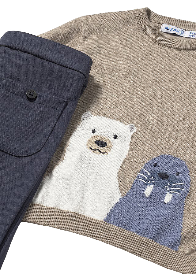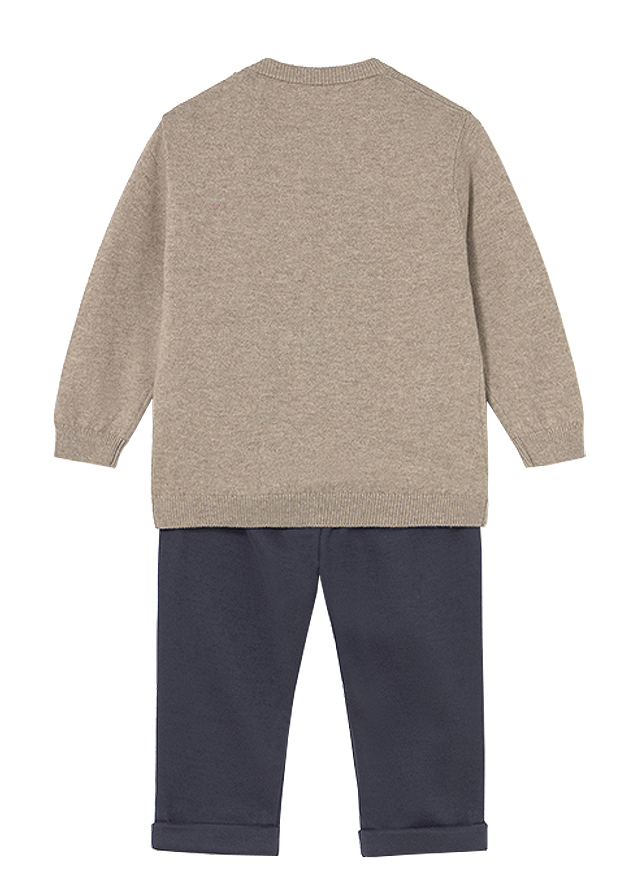 Set 2 piese - Pulover + pantaloni - gri/bleumarin Set este format: - pulover si pantaloni lungi. Puloverul acesta are guler rotund si inchidere cu nasturi pe umarul stang, pentru a usura imbracarea copilului.
