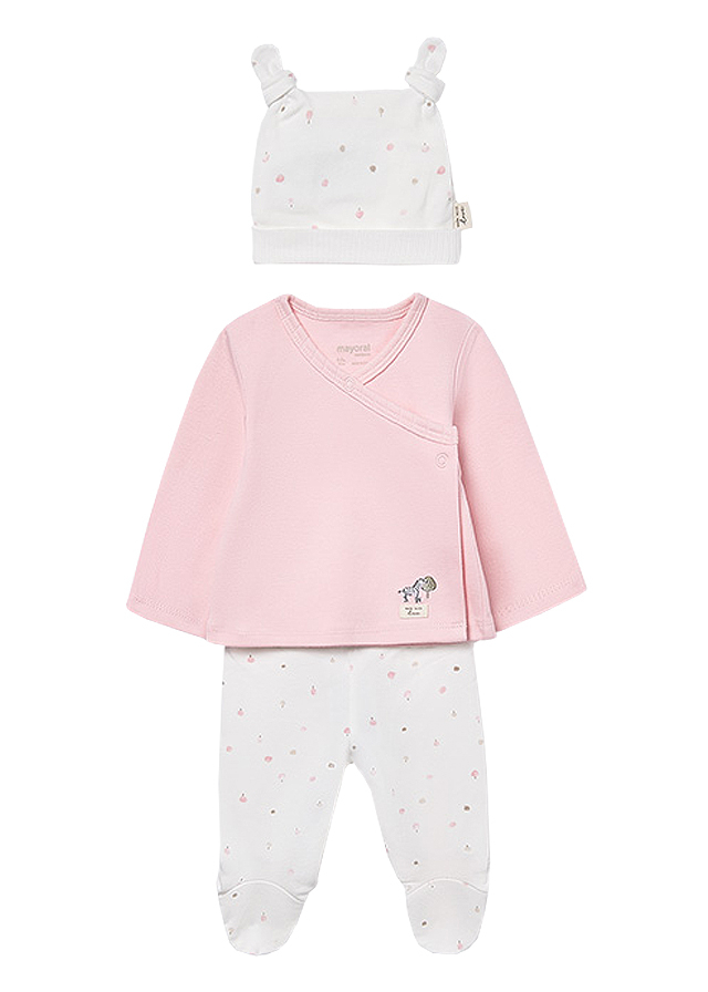 Set 3 piese - Bluza+pantaloni+caciulita - alb/rozSetul este format din trei piese: - bluza cu maneca lunga - pantaloni cu botosi - caciulita cu urechiuseSetul vine insotit de o cutie pliabila pe care o poti transforma rapid intr-o cutie de cadou eleganta!Bluza cu manca lungaBluza cu maneca lunga are gulerul in V incrucisat, iar inchiderea se face cu capse pe fata / lateral, pentru a facilita imbracarea bebelusului.