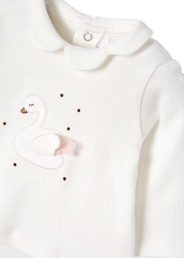 Tricoul cu maneca lunga, are gulerul tip camasa si inchidere cu capse pe spate, pentru a usura imbracarea micutei.Elemente decorative: aplicatii