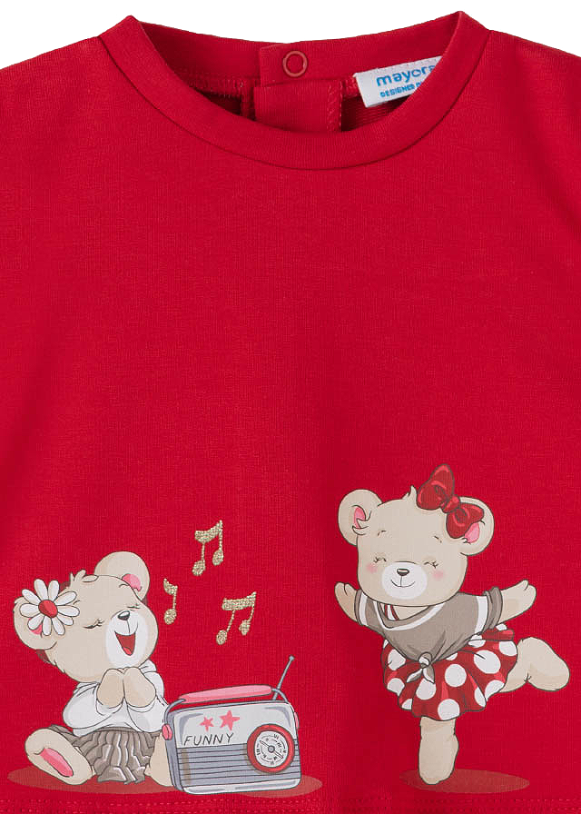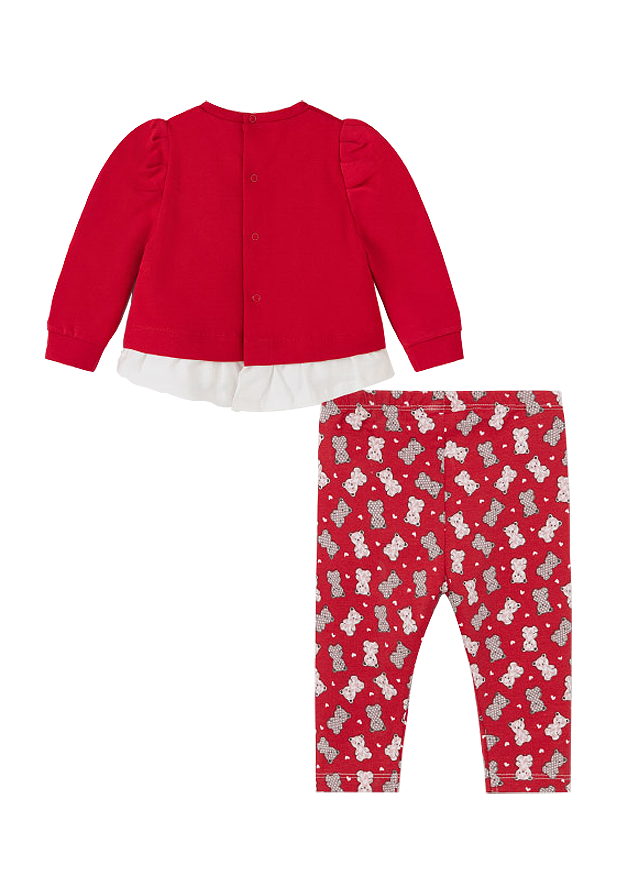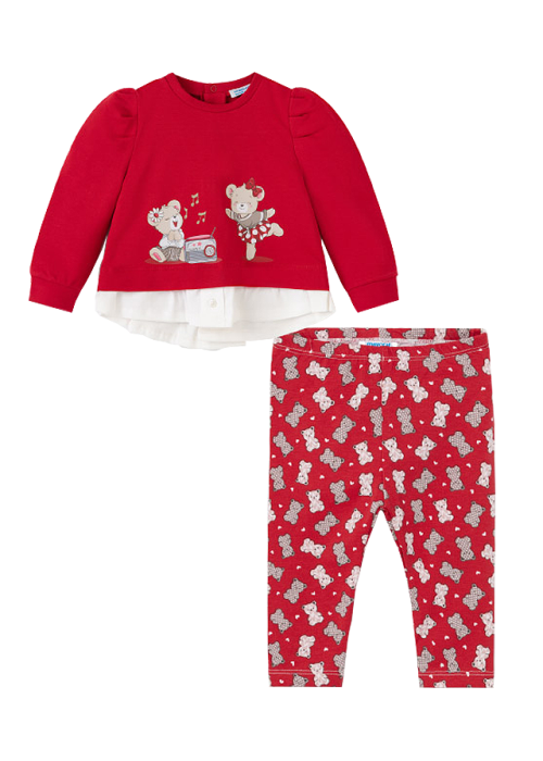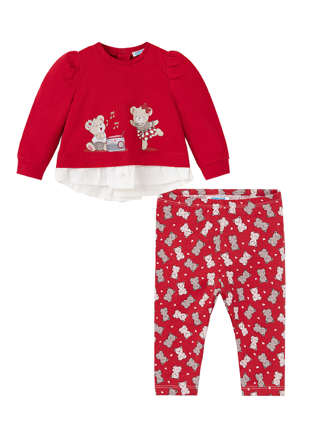Uscare: a se lasa la uscat pe o suprafata plata Calcare: max. 110°C, de preferat fara aburPantaloni lungiPantalonii sunt tip leggings.Acestia au elastic in talie pentru o mai buna ajustare.Material: 92% bumbac / 8% elastanCuloare: rosuImprimeu: ursuleti