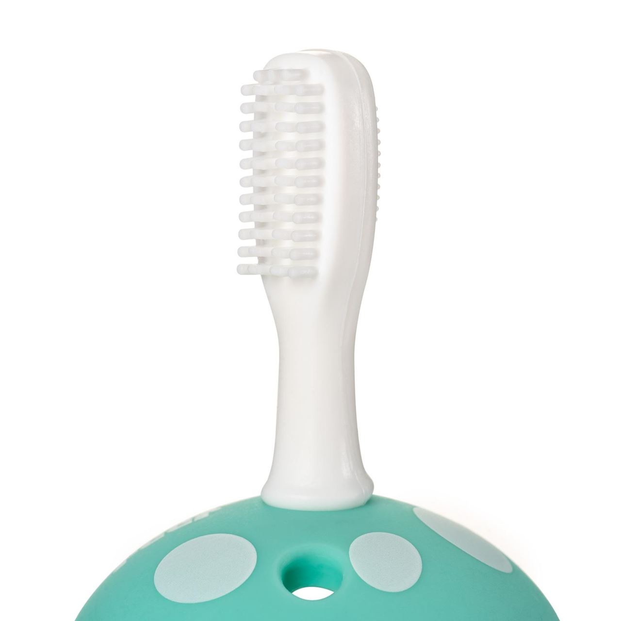 Set de ingrijire a dintilor in 2 etape format dintr-o periuta de dinti cu 2 terminatii: un cap de masaj care calmeaza durerea de dinti si o perie din silicon pentru ingrijirea primilor dinti mici. Recomandat de la 0 luni. Periajul adecvat pune bazele unor dinti sanatosi. De aceea, copiii ar trebui familiarizati cu o igiena orala aprofundata de la o varsta frageda. Cu setul de periute de dinti pentru antrenament, parintii pot practica ingrijirea dentara cu copiii lor chiar inainte de aparitia primilor dinti. Aceste periute de dinti de antrenament ii obisnuiesc treptat pe cei mici sa se spele pe dinti independent chiar de la inceput, pentru o dezvoltare sanatoasa a dintilor si pentru o mai buna igiena orala. Ingrijire dentara buna chiar inainte de aparitia primului dinteCel mai bun moment pentru a incepe rutina zilnica de igiena dentara este in timp ce copilului ii iese primul dinte. De aceea, setul de antrenament BabyCare de la Reer este format dintr-o periuta de dinti cu 2 terminatii - un cap de masaj care calmeaza durerea de dinti si o perie din silicon pentru ingrijirea primilor dinti mici. Reduce presiunea in timpul dentitiei cu ajutorul periei cu lame moi rezistente la muscaturi (pasul 1)Terminatia pentru masaj este un partener util in timpul dentitiei. Lamele moi dispuse de jur imprejur maseaza usor gingiile si bolta palatina si stimuleaza circulatia sangelui, care amelioreaza durerea de dinti. Diferitele structuri de pe suprafata periei ofera un efect de masaj variat. In acelasi timp, forma periutei de dinti il ajuta pe copilul sa se obisnuiasca sa se spele pe dinti mai tarziu. Ideal pentru primele incercari de periere cu ajutorul perilor moi din silicon (pasul 2)Primii dinti de lapte vor incepe sa apara atunci cand copilul are aproximativ 6 luni – momentul ideal pentru a intensifica igiena orala. Accesoriul periei pentru pasul 2 are dimensiunea ideala pentru a ajunge in toate zonele cavitatii bucale inca destul de mici. Perii elastici si extra-moi din silicon curata usor noii dinti si protejeaza gingiile sensibile de raniri. Sigur si practic datorita inelului ce protejeaza impotriva ranilor la nivelul gatuluiPentru ca inceputul unei rutine zilnice de periaj sa fie cat mai placut posibil pentru bebelusul dvs., riscurile trebuie sa fie reduse la minimum. Inelul distantier pastreaza intotdeauna periuta de dinti la o distanta sigura de gat si previne astfel ranile. Aceasta inseamna ca periajul poate fi practicat fara durere, facandu-l o experienta pozitiva. Perfect pentru antrenarea miscarii de periere cu ajutorul manerului ergonomic, antiderapantNu numai accesoriile pentru capul periutei au fost special adaptate la dimensiunea maxilarelor bebelusilor si copiilor mici. Manerul periutei este ideal si pentru mainile copiilor mici. Cu suprafata sa antiderapanta, faciliteaza practicarea miscarii corecte de periaj si incurajeaza copilul sa se spele pe dinti cu propriile maini. Pentru o utilizare igienica indelungata datorita detaliilor bine ganditeSetul de periute de dinti pentru antrenament BabyCare poate fi utilizat mai mult decat periutele de dinti conventionale. Pentru a permite o depozitare verticala, igienica, departe de murdarie si bacterii, periuta de dinti a fost prevazuta cu o ventuza ce adera la suprafetele netede. Inainte si dupa fiecare utilizare, periuta de dinti poate fi curatata rapid si usor sub apa calda curenta. Pentru o durata de viata lunga si deosebit de igienica, poate fi sterilizata intr-un sterilizator cu aburi. Lamele moi rezistente la muscaturi asigura o utilizare indelungata fara uzura. Sunt fabricate din silicon de inalta calitate, sigur pentru alimente, cenu contine substante nocive precum PVC, BPA, latex sau ftalati - pentru o utilizare complet sigura. Culoare: alb/menta. Recomandat de la 0 luni.
