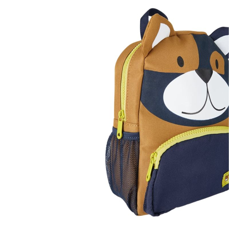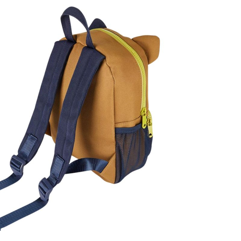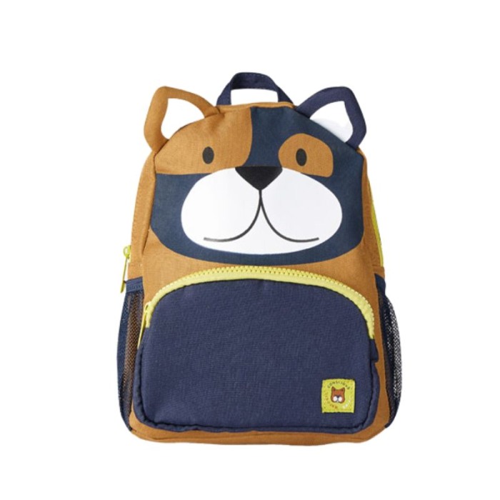 Ghiozdan original si practic pentru copii. Un produs atractiv si distractiv pentru a completa orice look.Urechi aplicate si buzanar fata aplicate, inchidere cu fermoar.Ghiozdanelul mai are eticheta interioara petru notarea numelui copilului, bretele reglabile si doua buzunare laterale din plasa pentru sticlute.Culoare: albastru/ocru/bej Dimensiuni: 26 x 20 cm.