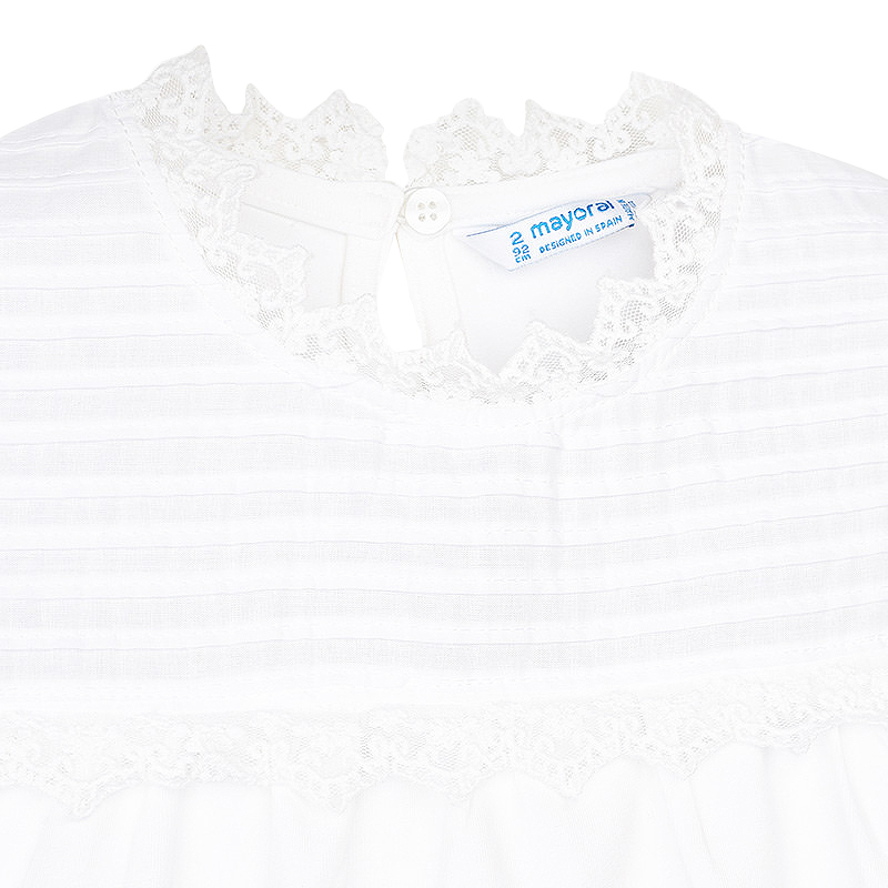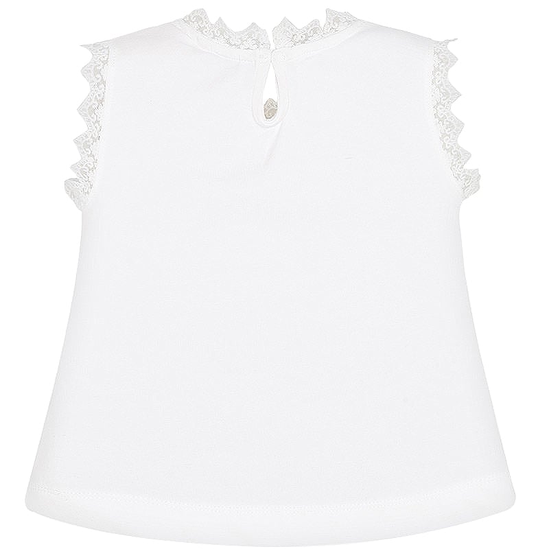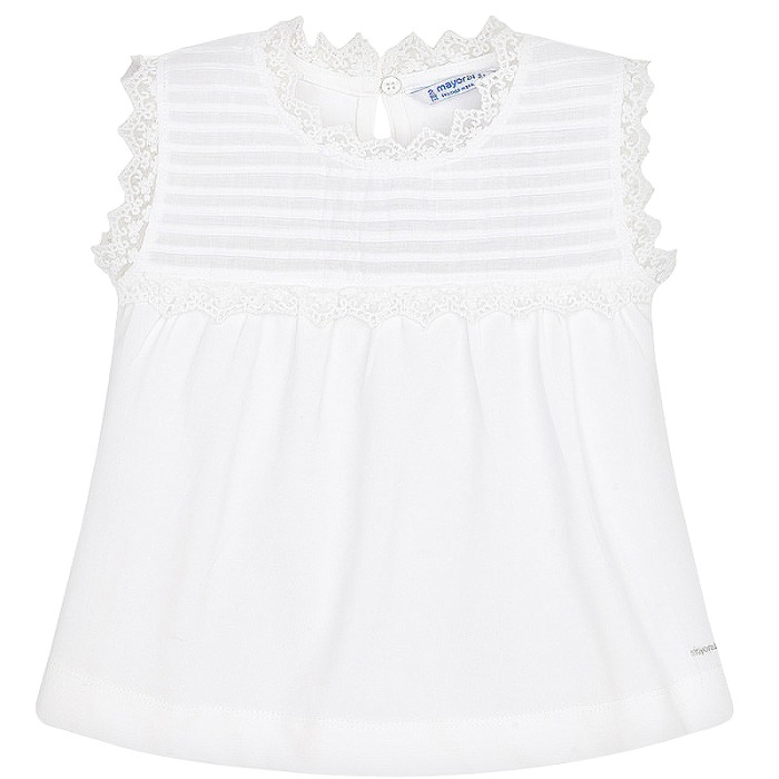 Bluza alba fara maneciTricou fara maneca pentru fetite. La baza gatului are o dantela eleganta de bumbac si se inchide cu un singur nasture la spate. Elementele decorative sunt din dantela.Material: 100% bumbacCuloare: albIntretinere: