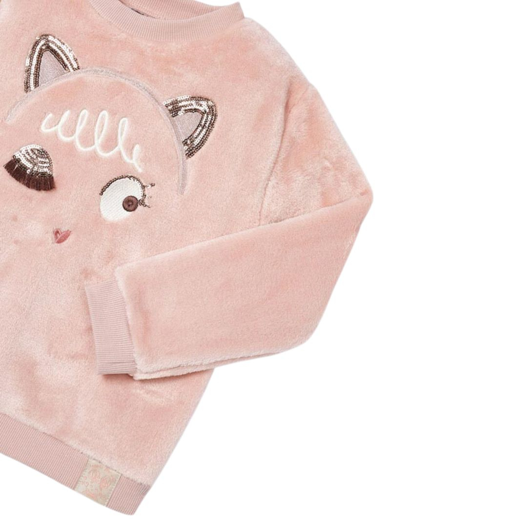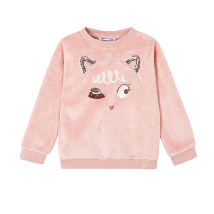 Bluza sport blanita aplicatii urechiuse pisica - Mayoral Bluza cu maneca lunga are mansete elastice si guler rotund. Dintr-un plus moale si catifelat bluzita este foarte calduroasa si confortabila.Design: pisicutaMaterial:85% Poliester