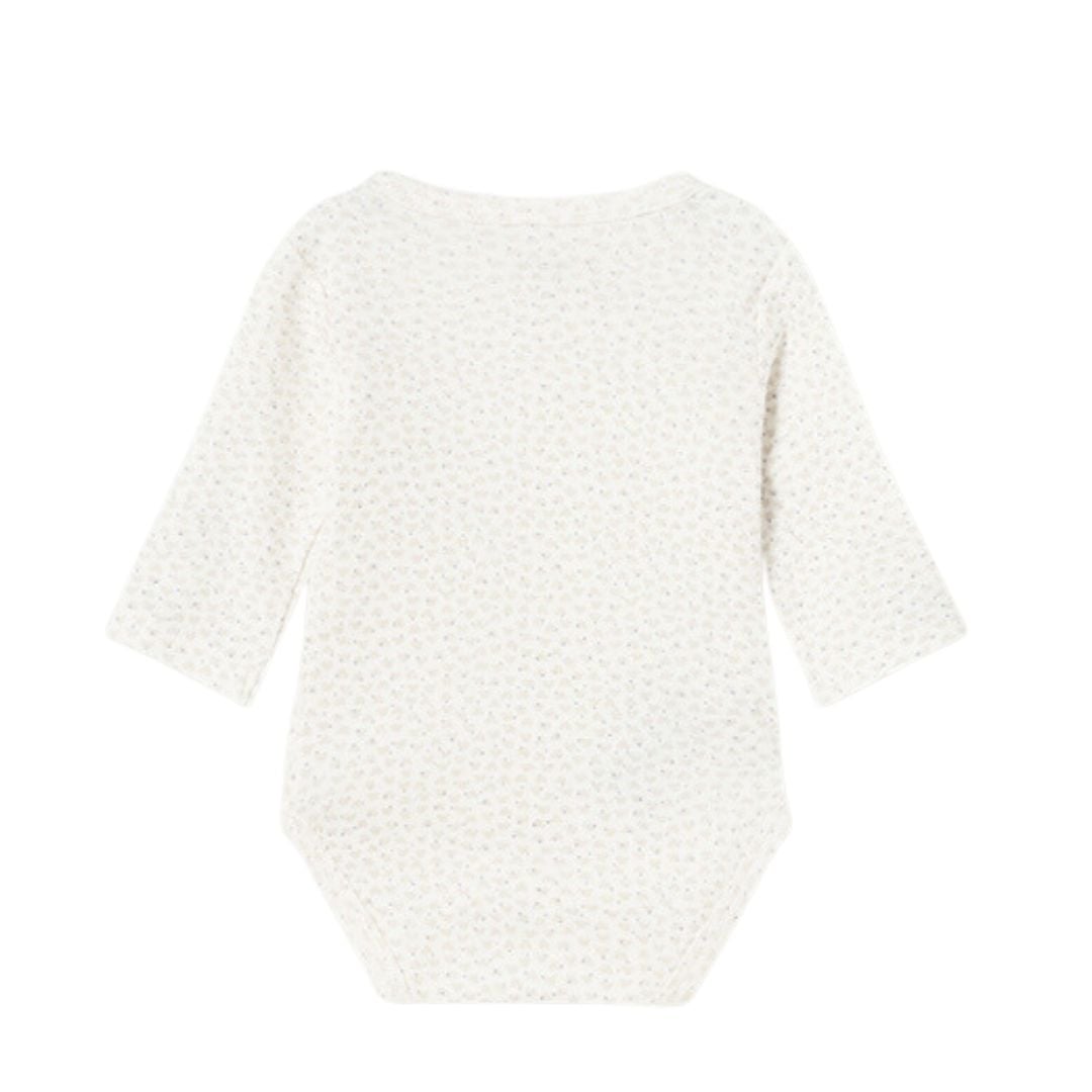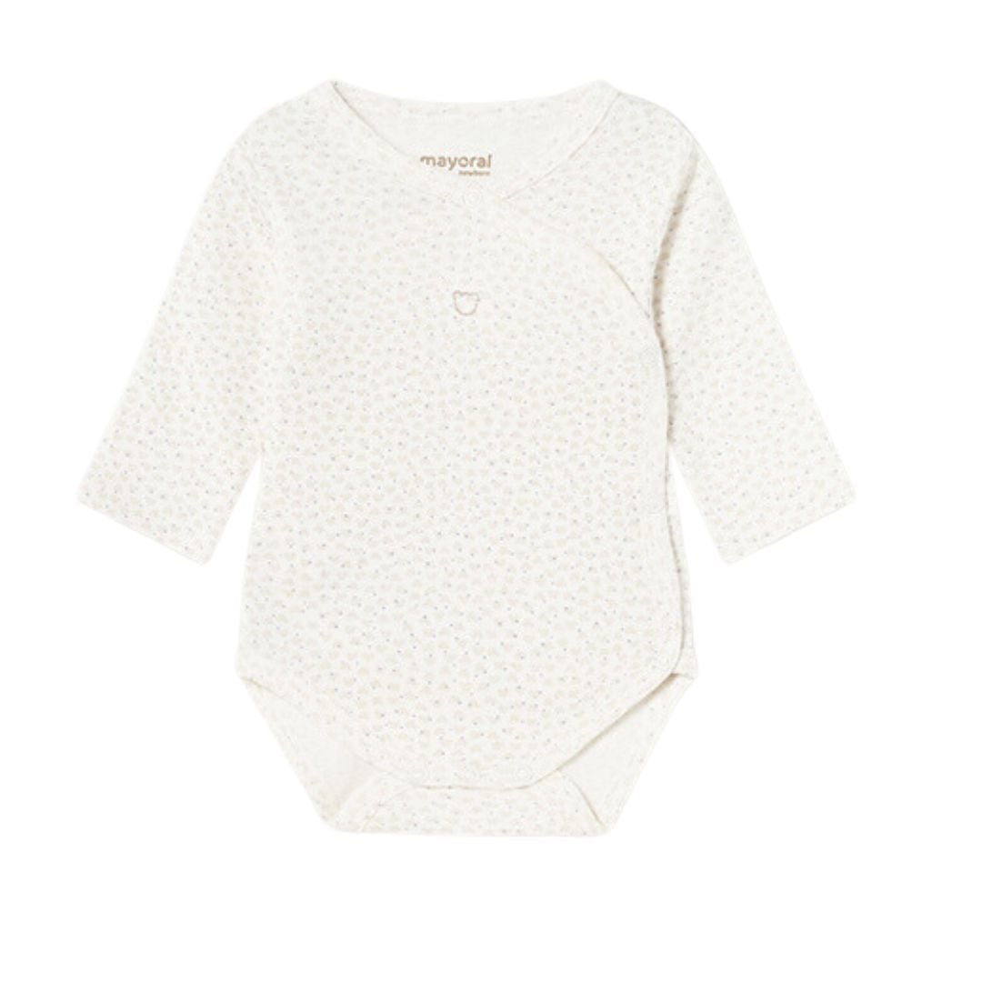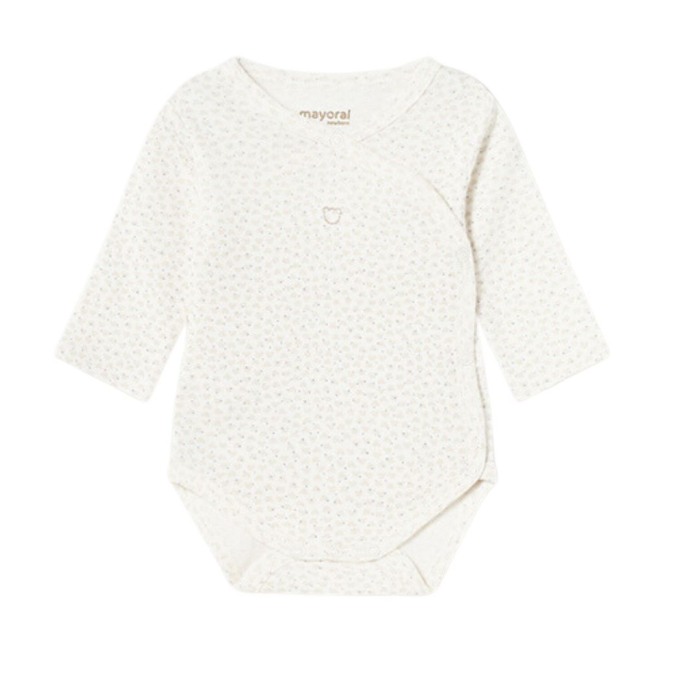 Body Better Cotton nou-nascutBody-ul cu maneca lunga are guler in V, iar inchiderea se face cu doua capse pe partea dreapta si cu 3 capse, in partea de jos.Tesatura este rezistenta la spalat.Se poate folosi in toate anotimpurile anului.Material: 100% bumbacCuloare: albImprimeu: picatele bejIntretinere: