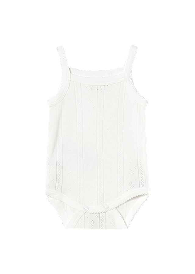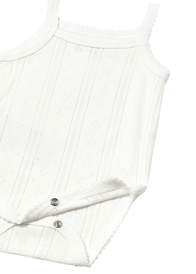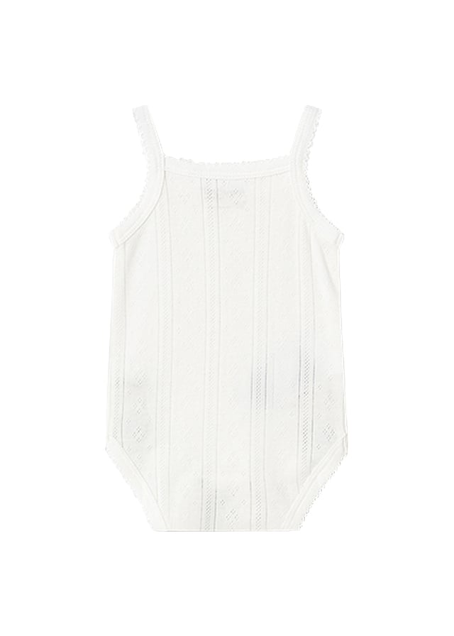 Body cu bretele - Alb Body-ul cu bretele are guler patrat si se inchide cu 2 capse intre picioare pentru a facilita imbracarea bebelusului.Tesatura fina cu perforatii mici in forma de romburi. Elemente decorative: fundita.Material: 100% bumbacCuloare: albIntretinere: