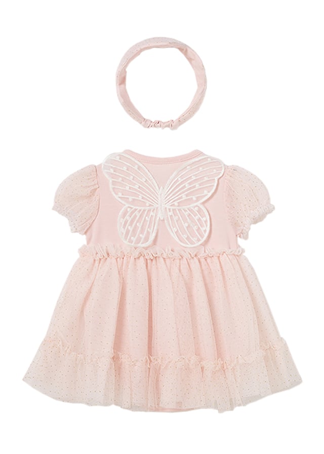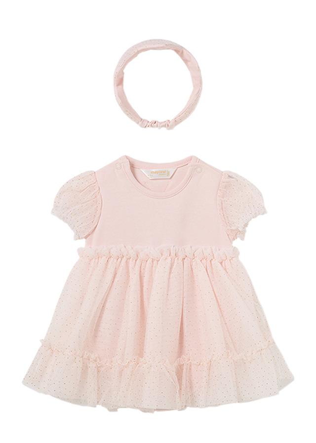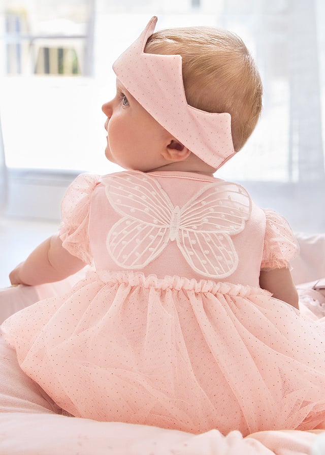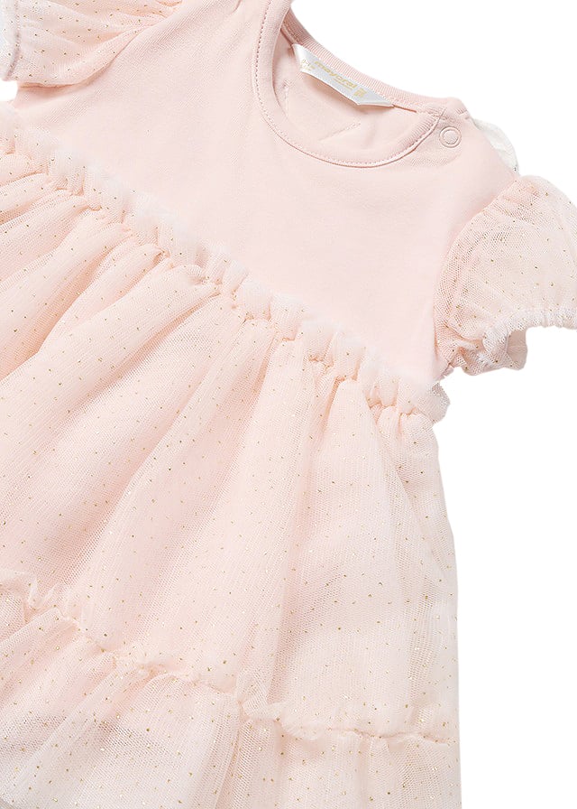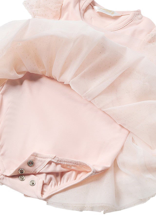 Body cu fusta tul si bentital Roz pentru nou-nascut - Mayoral Body-ul are un gulerul rotund si manecuta incretita.Acesta are inchidere pe umar cu 3 capse si in partea de jos alte 3 capse, pentru ca bebelusul sa poata fi imbracat usor.Materialul este de buna calitate, rezistent la spalat, iar culorile se pastreaza in timp.Fustita din tul este incretita la mijloc si are un volanas amplu la poale.