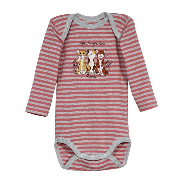 Body cu maneca lungaBody-ul se prinde in partea de jos cu trei capse.Materialul este de buna calitate, rezistent la spalat, iar culorile se pastreaza in timp.Se poate folosi in toate anotimpurile anului.Material: 100% bumbac Culoare: gri / rozImprimeu: dungi / animaleIntretinere: