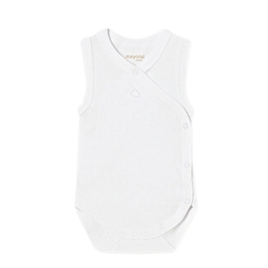 Body fara maneci ECOFRIENDS - Alb - Mayoral Body-ul maiou este ideal pentru perioada calda sau pentru a fi imbracat sub alte hainute.Gulerul este incrucisat cu deshidere laterala si inchidere cu 3 capse pe partea dreapta si 3 capse in partea de jos pentru a facilita imbracarea body-ului. Se poate folosi in toate anotimpurile anului.In cazul marimilor mai mari (4-6 luni - 18 luni), inchiderea laterala este inlocuita de o deschidere la umar.Material: 100% bumbacCuloare: AlbIntretinere:
