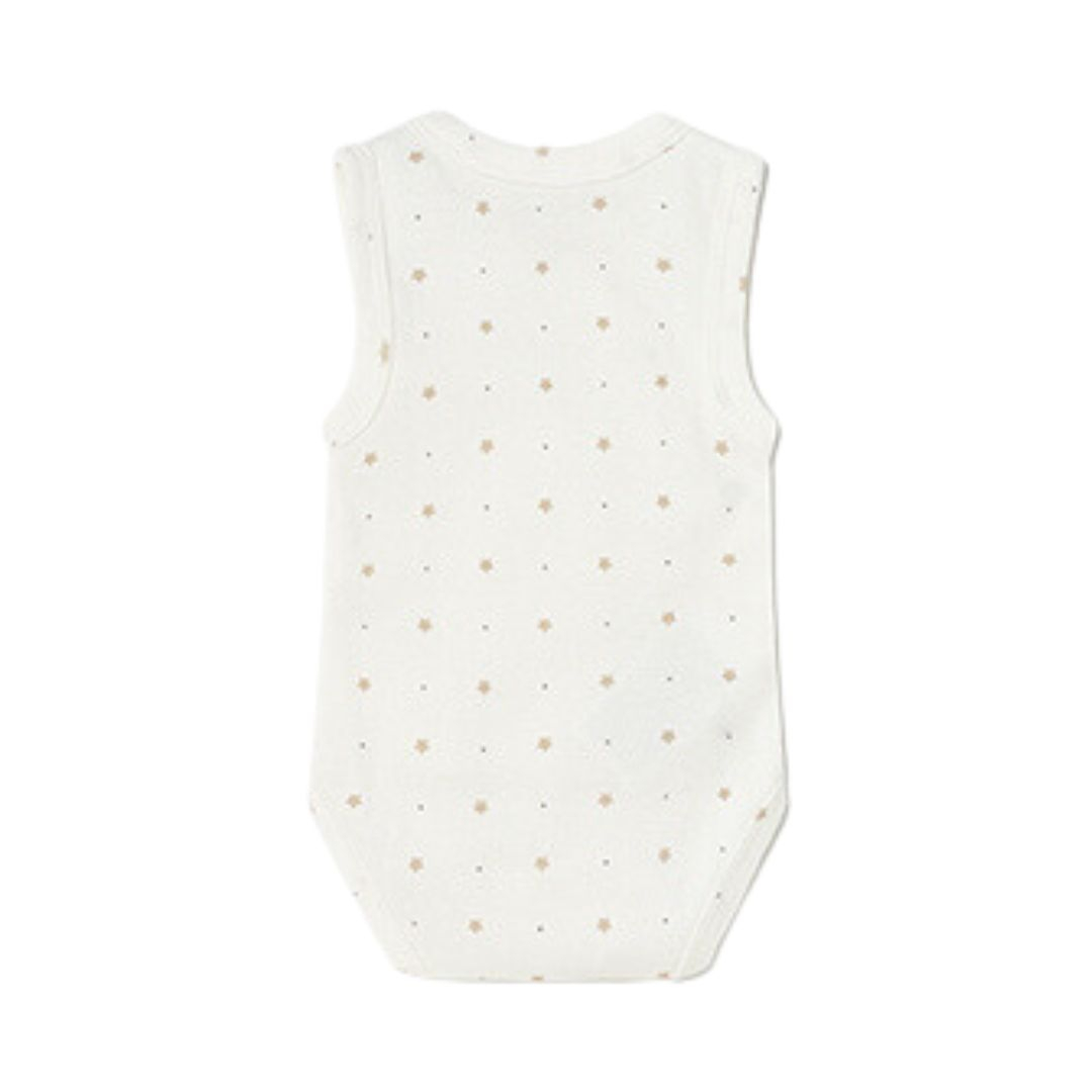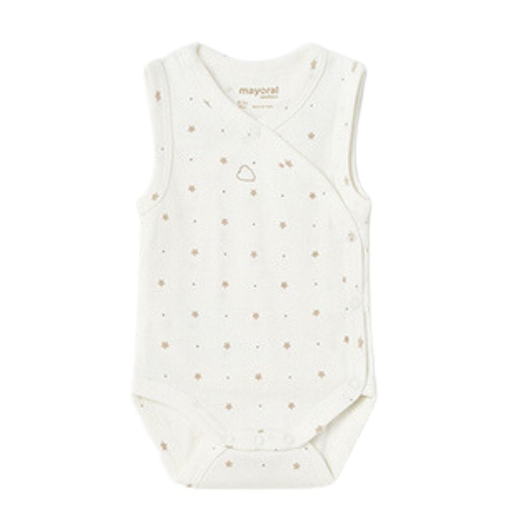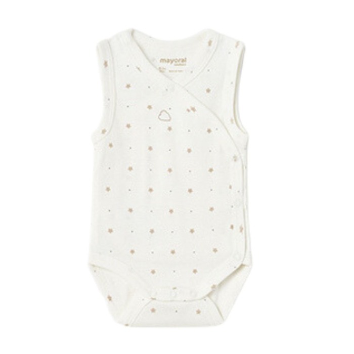Body fara maneci ECOFRIENDS - Stelute bej - Mayoral Body-ul maiou este ideal pentru perioada calda sau pentru a fi imbracat sub alte hainute.Gulerul este incrucisat cu deshidere laterala si inchidere cu 3 capse pe partea dreapta si 3 capse in partea de jos pentru a facilita imbracarea body-ului. Se poate folosi in toate anotimpurile anului.In cazul marimilor mai mari (4-6 luni - 18 luni), inchiderea laterala este inlocuita de o deschidere la umar.Material: 100% bumbacCuloare: Off-whiteImprimeu: stelute mici bejIntretinere:
