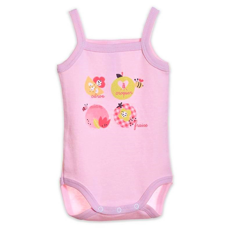 Body maiou imprimeu FructeBody-ul maiou este ideal pentru perioada calda iar bretelele foarte subtiri il fac practic pentru a fi imbracat sub alte hainute. Este prevazut cu 3 capse in partea de jos. Materialul si imprimeul sunt de calitate si rezista in timp si la spalat. Material: 100% bumbac Culoare: roz palImprimeu: fructeIntretinere: Spalare: automata / manuala Temperatura: max. 30°C Interzis: albirea si uscarea la tambur Calcare: temperatura medie Fabricat in Romania