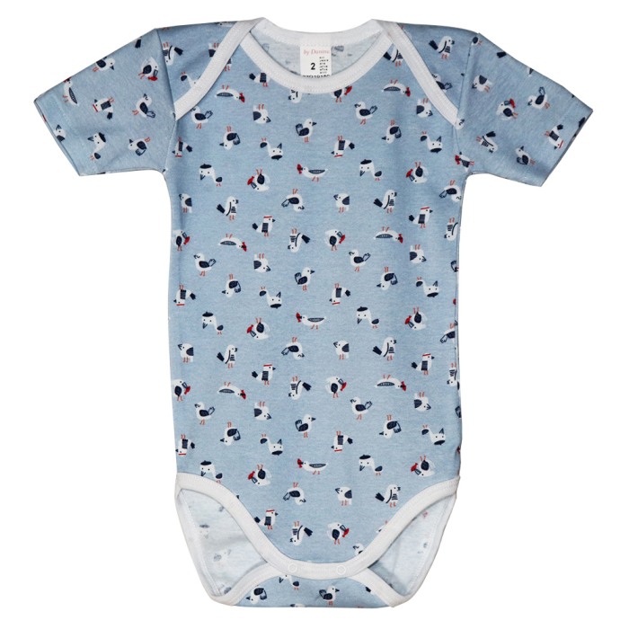 Body maneca scurta bleu Pescarusi Body-ul cu maneca scurta este ideal pentru perioada calda sau pentru a fi imbracat sub alte hainute. Este prevazut cu 3 capse in partea de jos. Materialul si imprimeul sunt de calitate si rezista in timp si la spalat. Material: 100% bumbac Culoare: bleuImprimeu: PescarusiIntretinere: Spalare: automata / manuala Temperatura: max. 30°C Interzis: albirea si uscarea la tambur Calcare: temperatura medie Fabricat in Romania