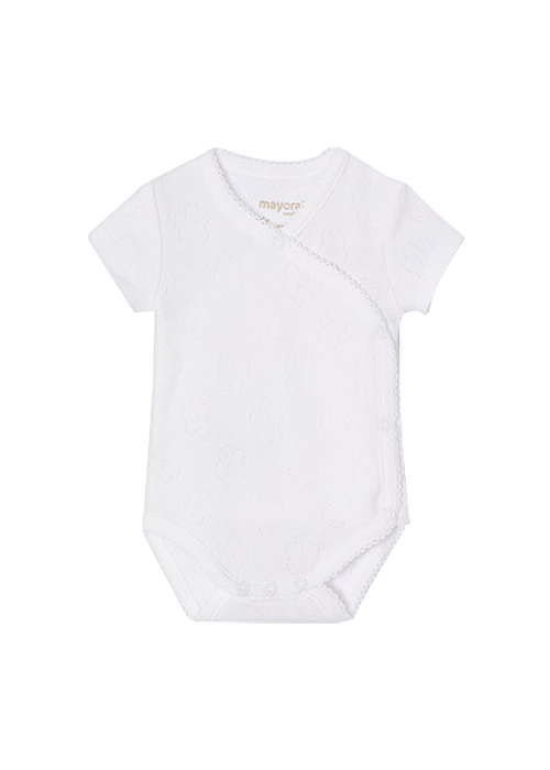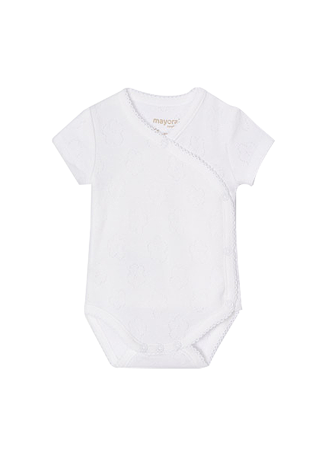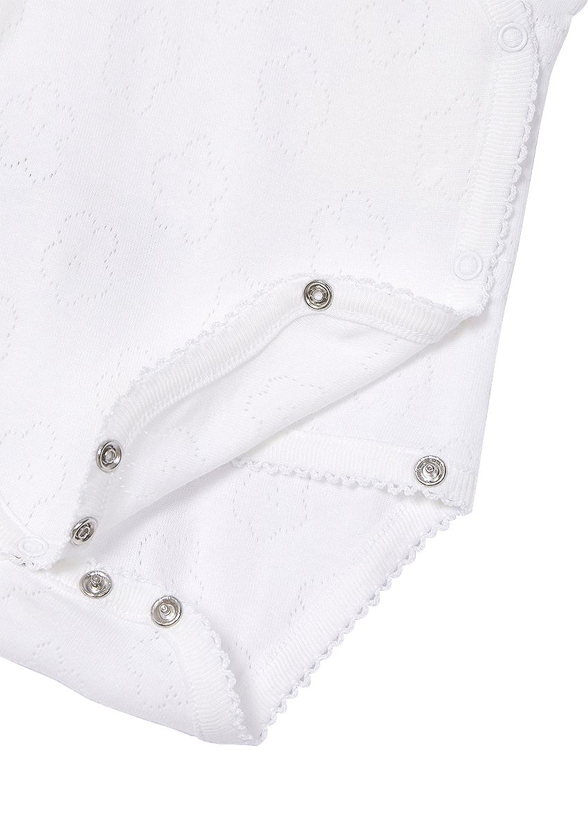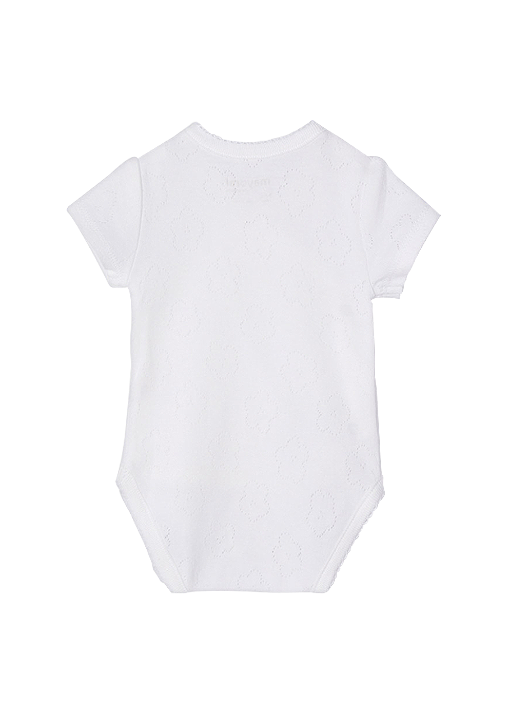 Body maneca scurta ECOFRIENDS - AlbBody-ul cu maneca scurta are guler in V, iar inchiderea se face cu doua capse pe partea dreapta si cu 3 capse, in partea de jos.Tesatura este fina cu perforatii mici in forma de floare si rezistent la spalat.Se poate folosi in toate anotimpurile anului.Material: 100% bumbacCuloare: albIntretinere:
