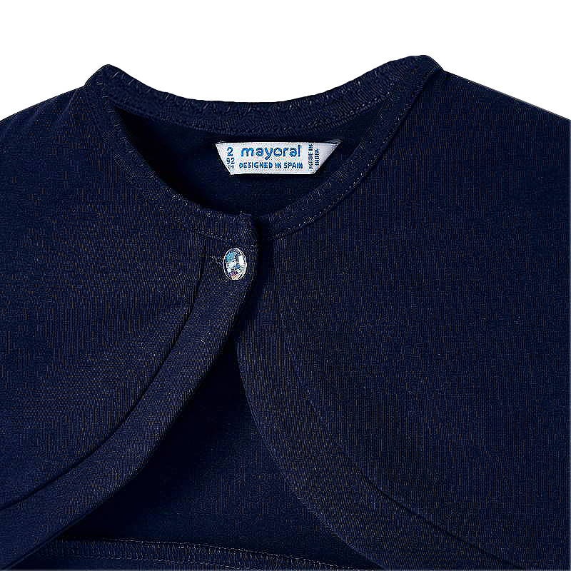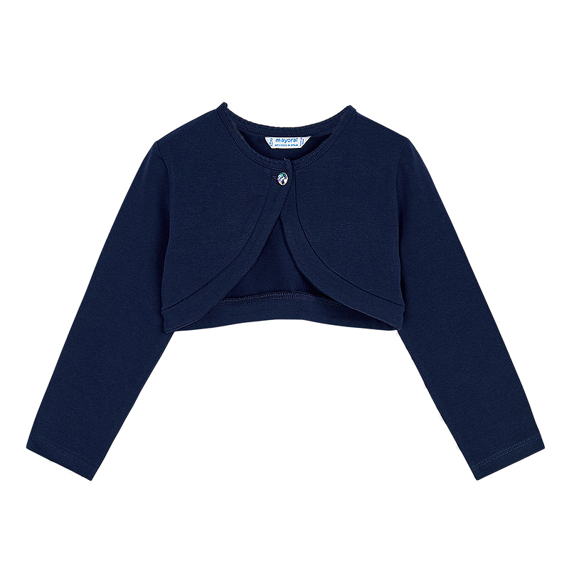 Bolero clasic tricotat - AlbastruAcest bolero cu maneca lunga are gulerul rotund si inchidere cu un singur nasture pe decolteu.