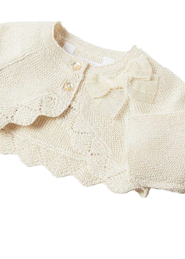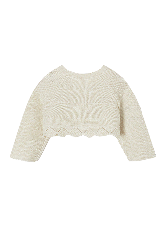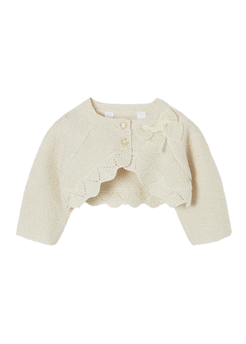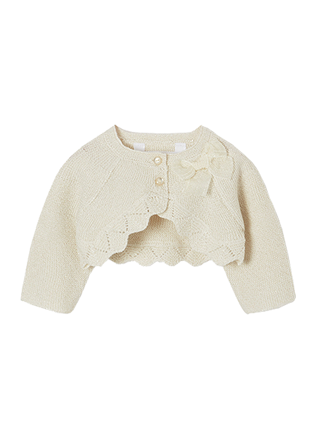 Este un model scurt, tip bolero si cu terminatii ondulate, tip dantela crosetata.Design cu terminatii ondulate si funda aplicata.