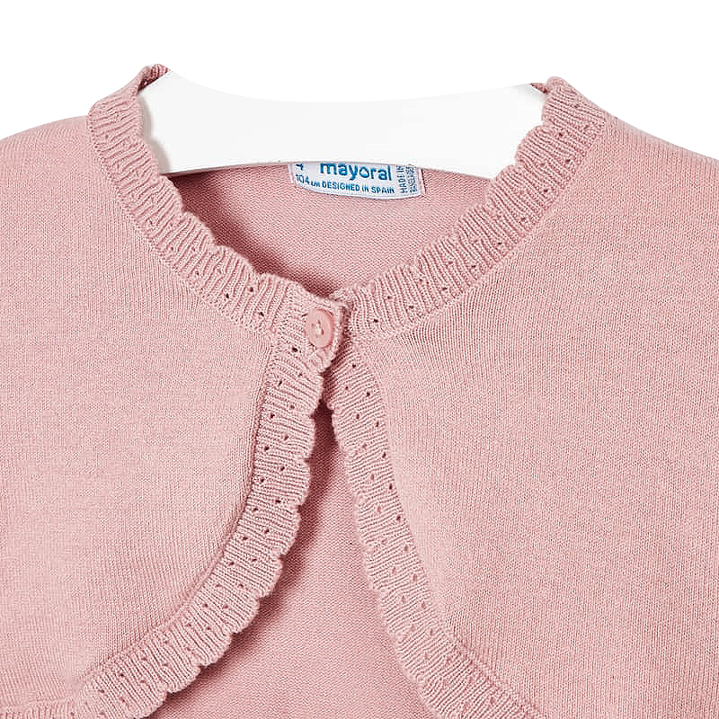 Este un model scurt, tip bolero si cu terminatii ondulate, tip dantela crosetata.Design cu terminatii ondulate.Material tricotat fin, moale si placut la atingere.